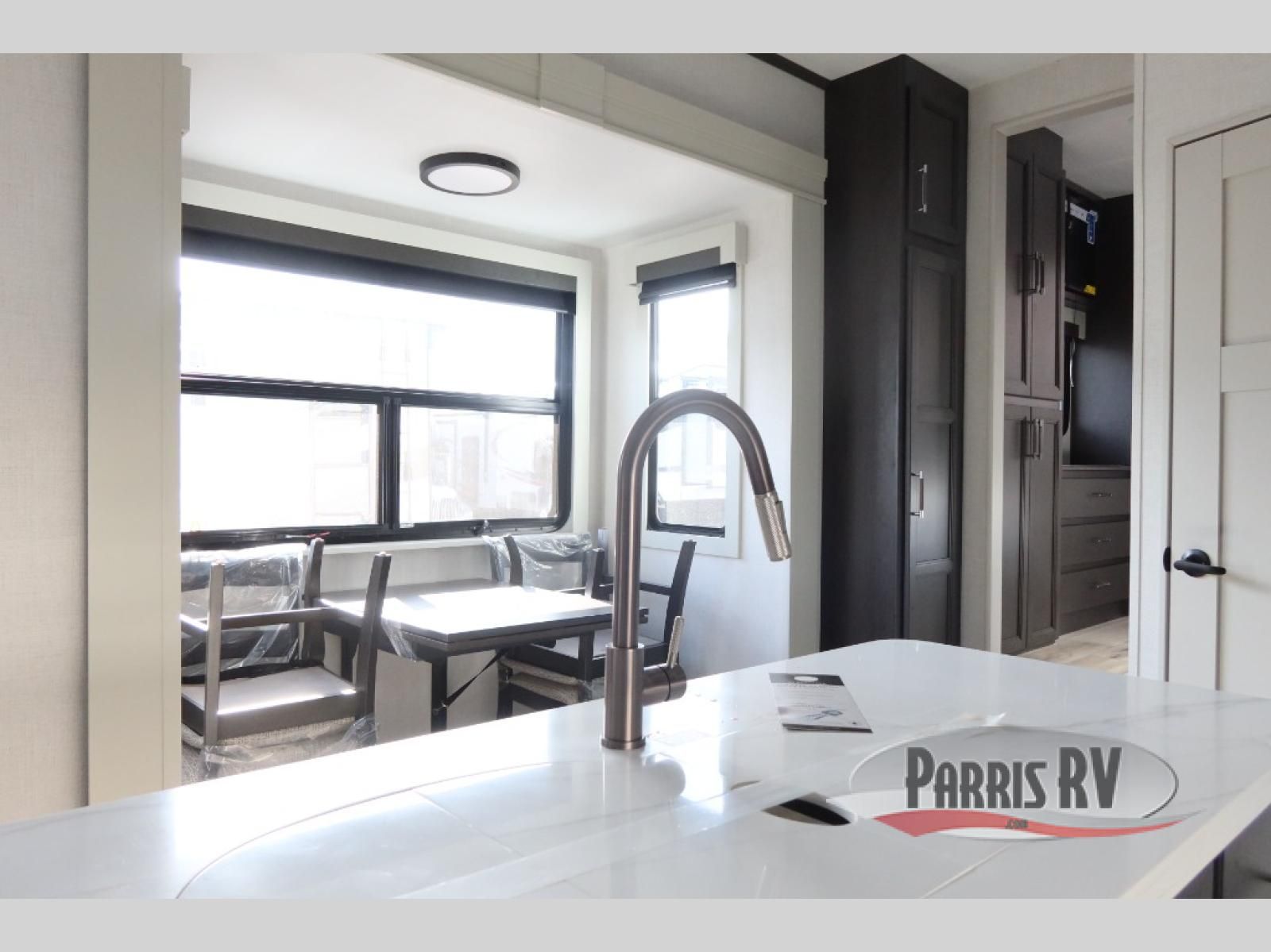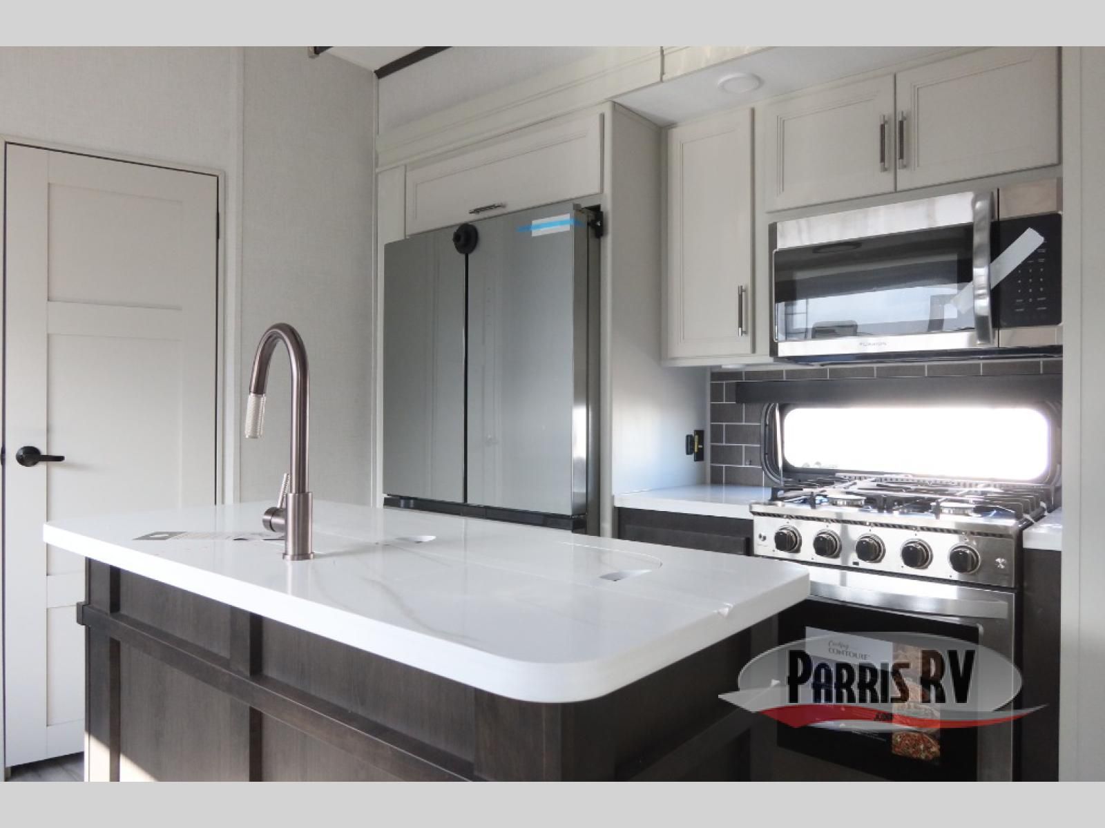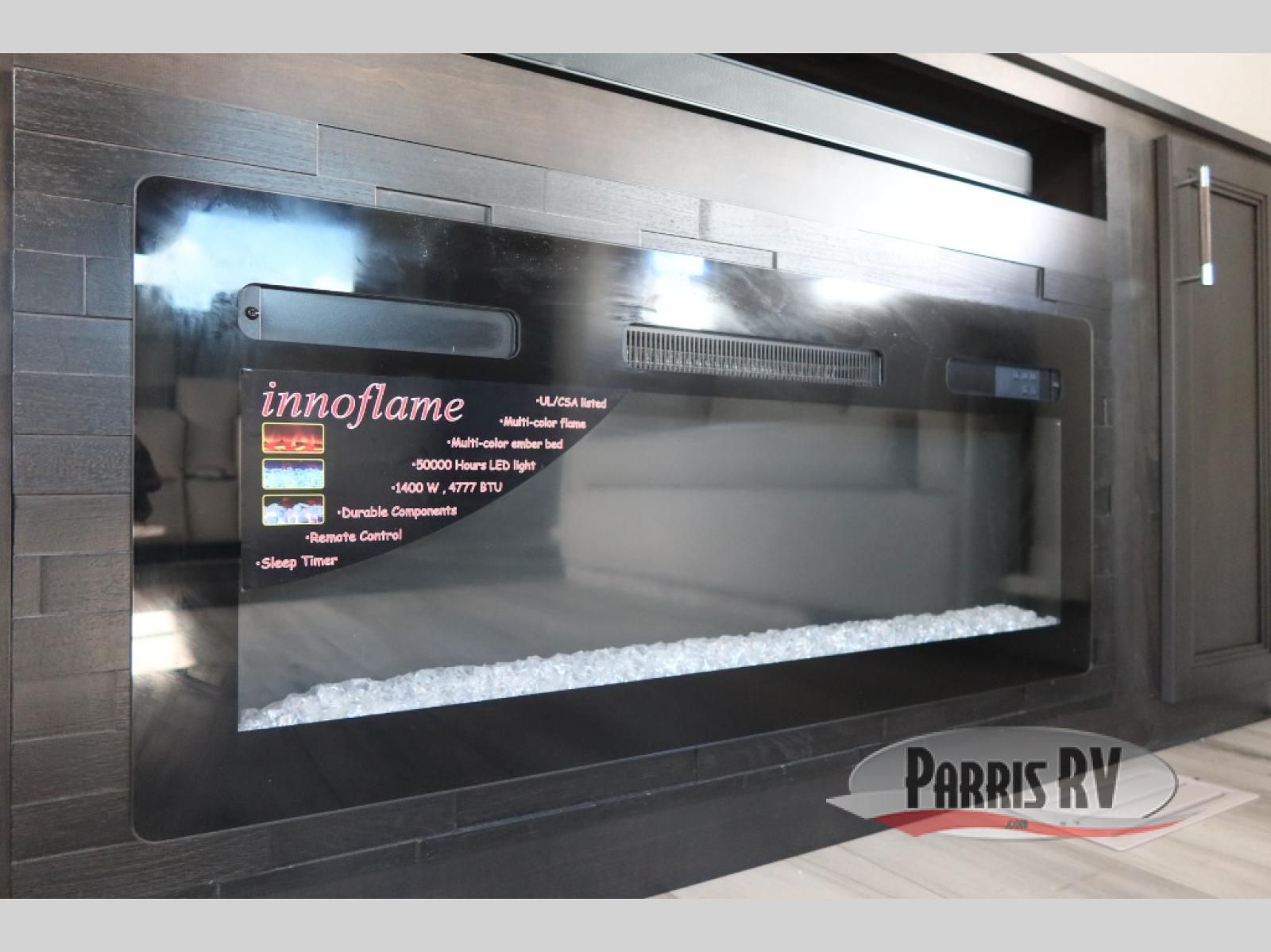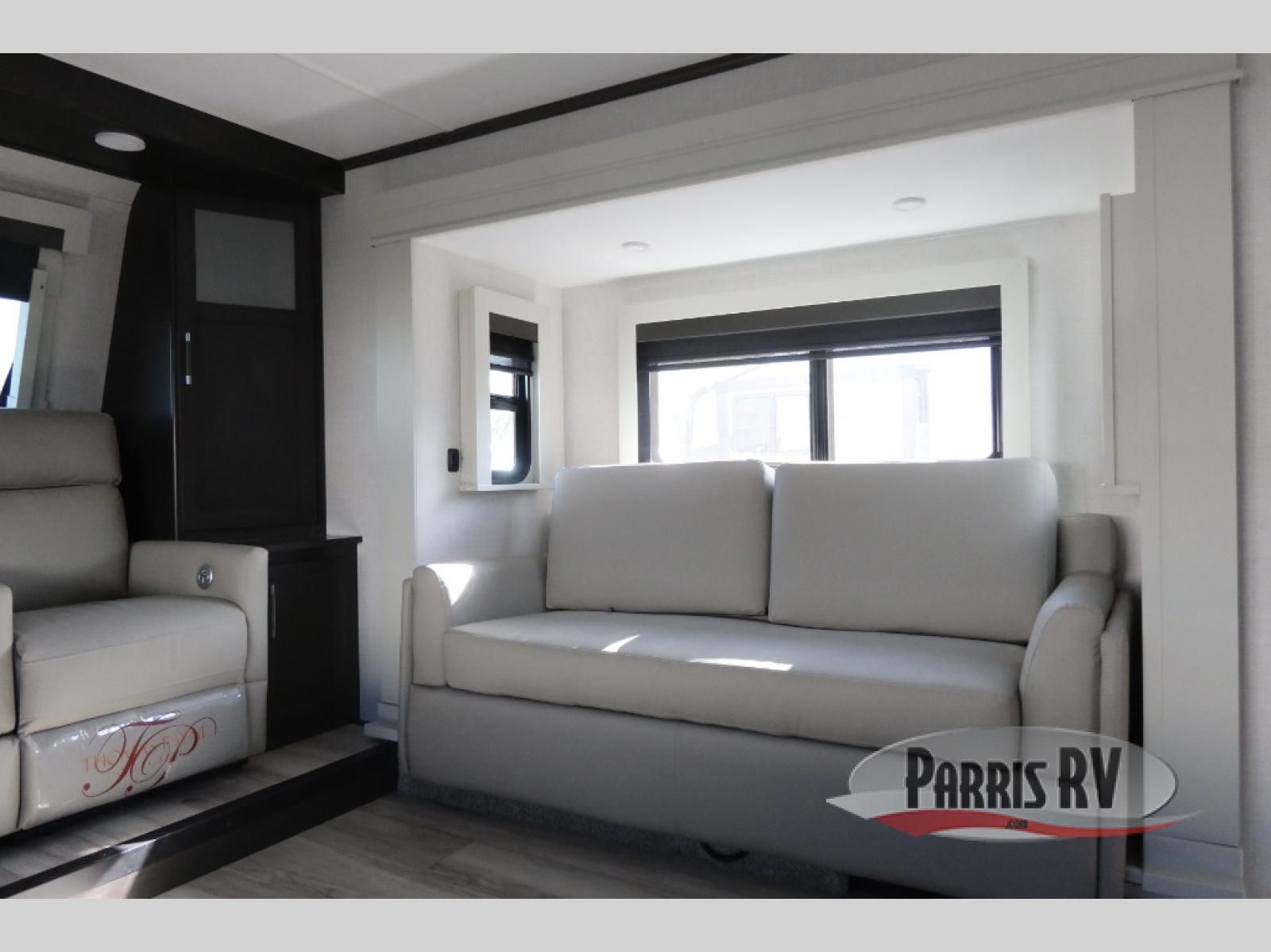 Find the comfort and luxury in this fifth wheel! Imagine your morning coffee on the spacious middle kitchen, and prepping your favorite breakfast on your kitchen island with a sink, making for a good meal-prep zone for endless cooking possibilities. You can start your favorite movie queued up in the living room with dual hide-a-bed sofas and a fireplace that sets the mood for comfort and delight every day. When it is time to unwind, your private rear bedroom welcomes you with a king bed, smart storage, and soft lighting that turns travel into rest**,** featuring a master bathroom with all you need to freshen up and treat yourself with plenty of storage, a dual sink vanity, and space for a washer/dryer prep for your convenience.