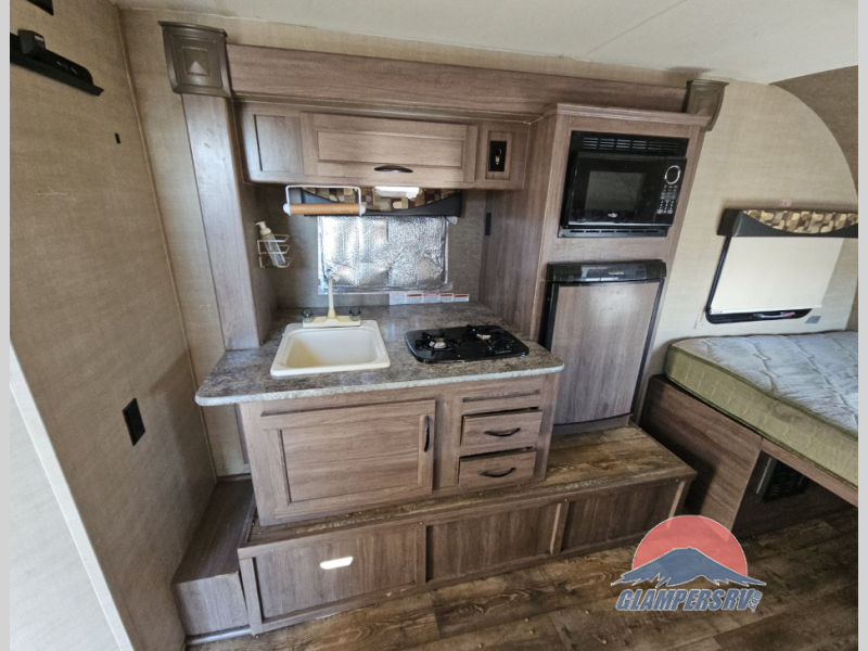 You will have years of fun in this Mighty Lite travel trailer for a couple, plus one! Take this unit out on your next family vacation and have a grand ole time. The cook in the family will love having the extra space to walk around, thanks to the slide out, while they are making your favorite meals. You will be able to bring whatever you would like to have with you because there is a wardrobe in the rear and plenty of overhead cabinetry.