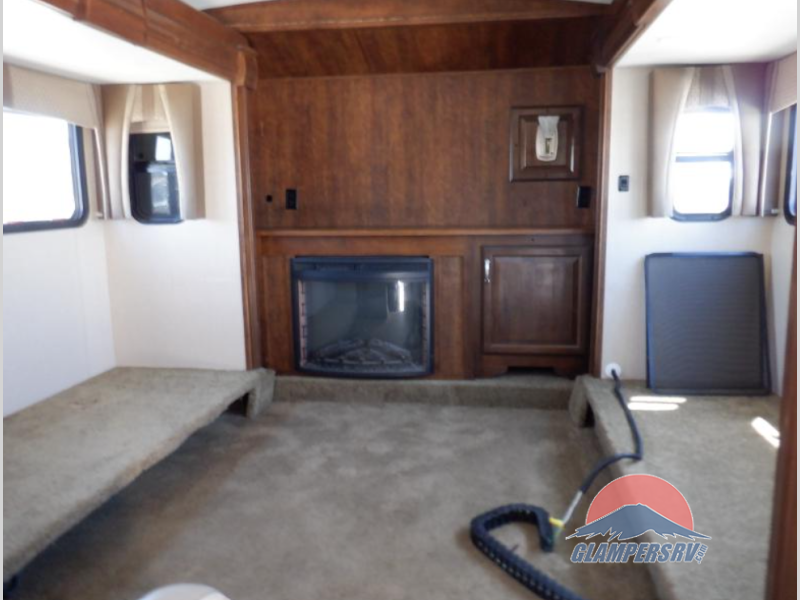 As you enter the fifth wheel, step up to the right to a front living area. There are two slides, one on either side of the fifth wheel. Both slides have a comfortable sofa. There is also theater seating with overhead cabinets, and along the front wall you can watch TV on the 58" LED TV and enjoy the fireplace just below.