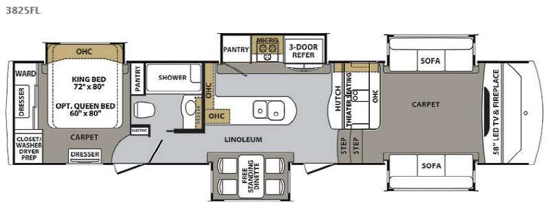 The Cardinal 3825FL fifth wheel by Forest River offers so much room from five slides, dual entries, and a front living area. You will be wowed by the number of features this fifth wheel has to offer!