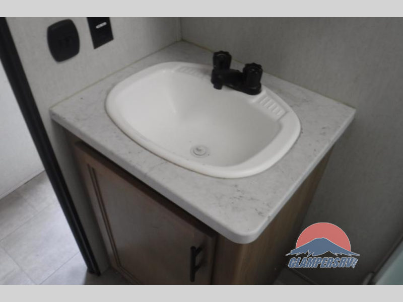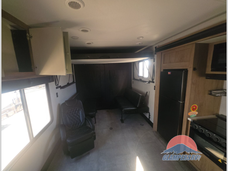 Enjoy each trip to the campground with this toy hauler that can sleep six people each night. When you arrive at your destination, set up the 12' patio awning, grab the lawn chairs from the outside storage compartment, and enjoy some fresh air. Inside, you can make lunch on the three burner cooktop or in the microwave oven, and there is a refrigerator here for your perishables. The full bath will allow you to clean up after trail riding, and the flip-up bed up front will provide a great night's rest. There is a quick set queen bed system in the garage area, plus dual flip-up sofas for your guests!