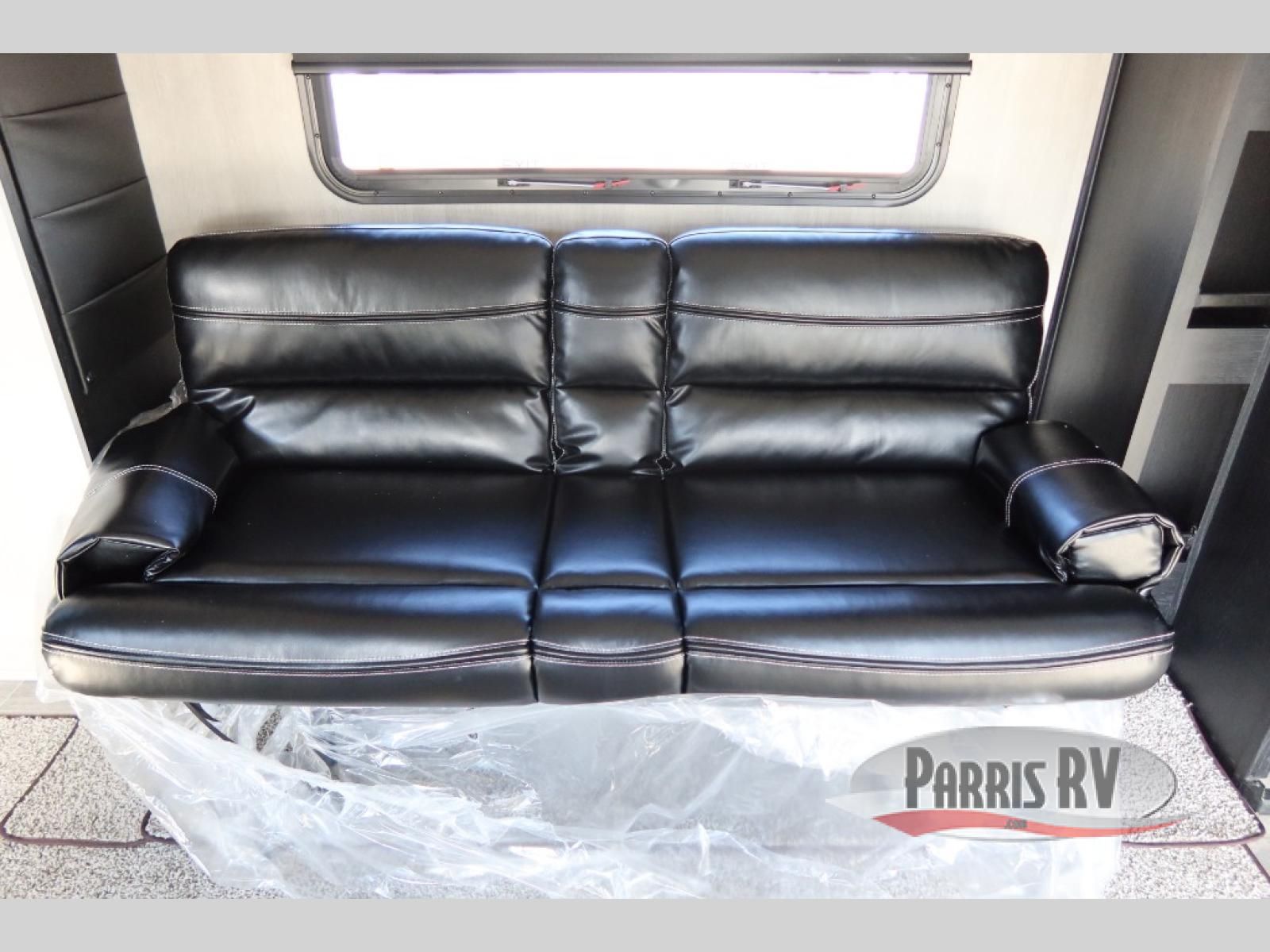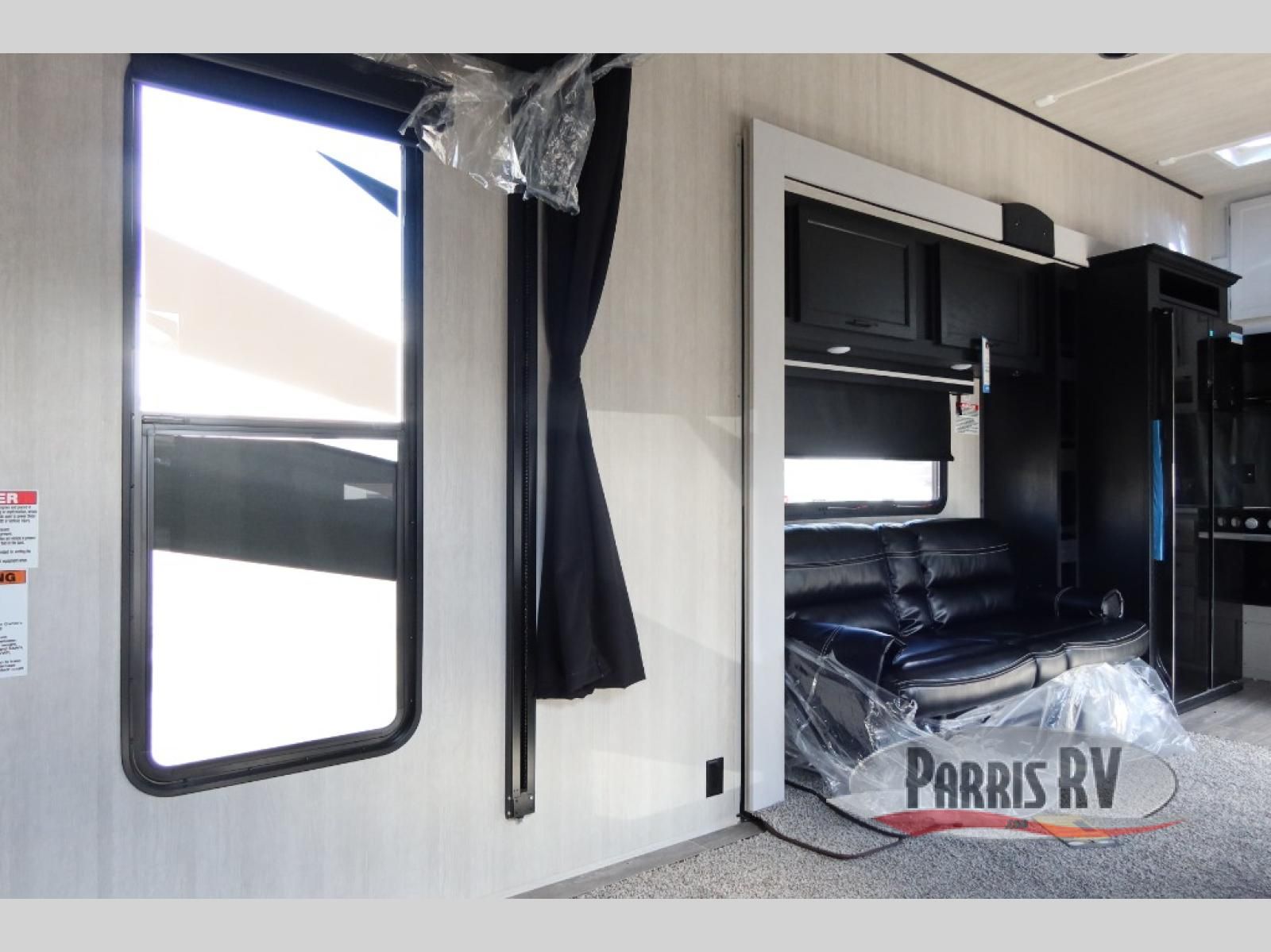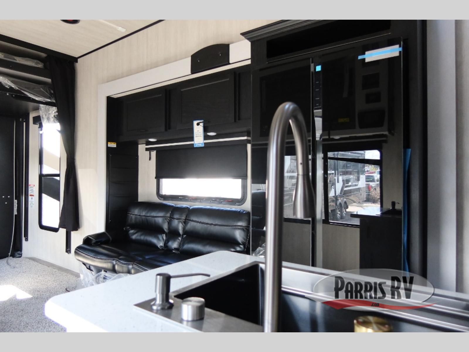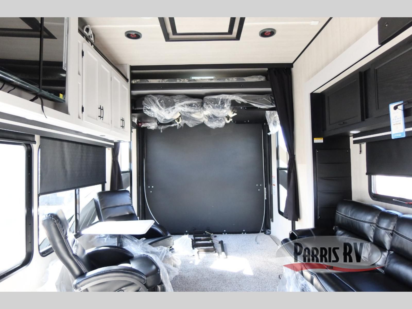 Wherever you decide to camp, this toy hauler is sure to bring fun. There is a front master bedroom with an RV king bed and a nightstand, plus a vanity/wardrobe slide that will provide more space. Your guests can sleep on the power queen bed after the toys are unloaded from the 16' 4" garage, and in the morning, they can relax on the power sofa bed under the top bed. The kitchen includes everything you need each day to prepare meals; a three burner cooktop, microwave oven, and an extra large double door refrigerator. You'll also appreciate the slam-door luggage compartments to store your larger camp gear, the 40 gallon fuel station to keep your toys ready to go, and the power awning with LED lights for an outdoor living space!