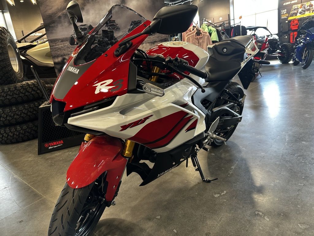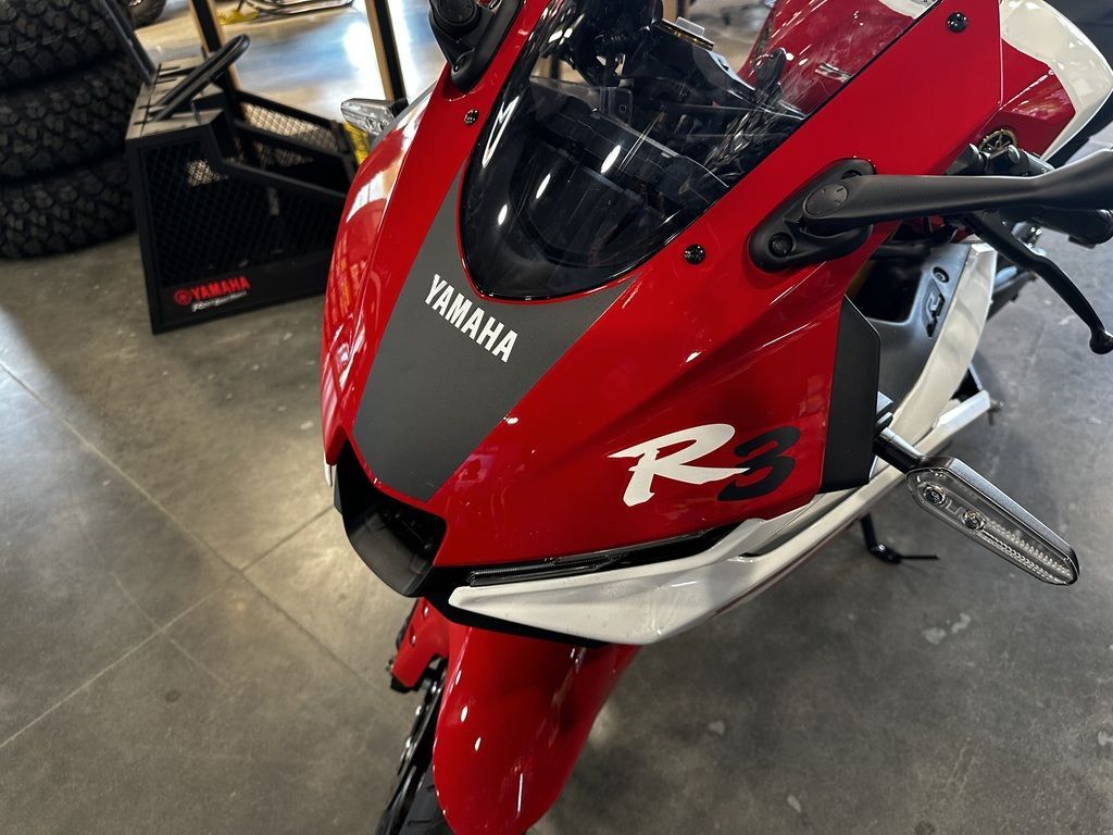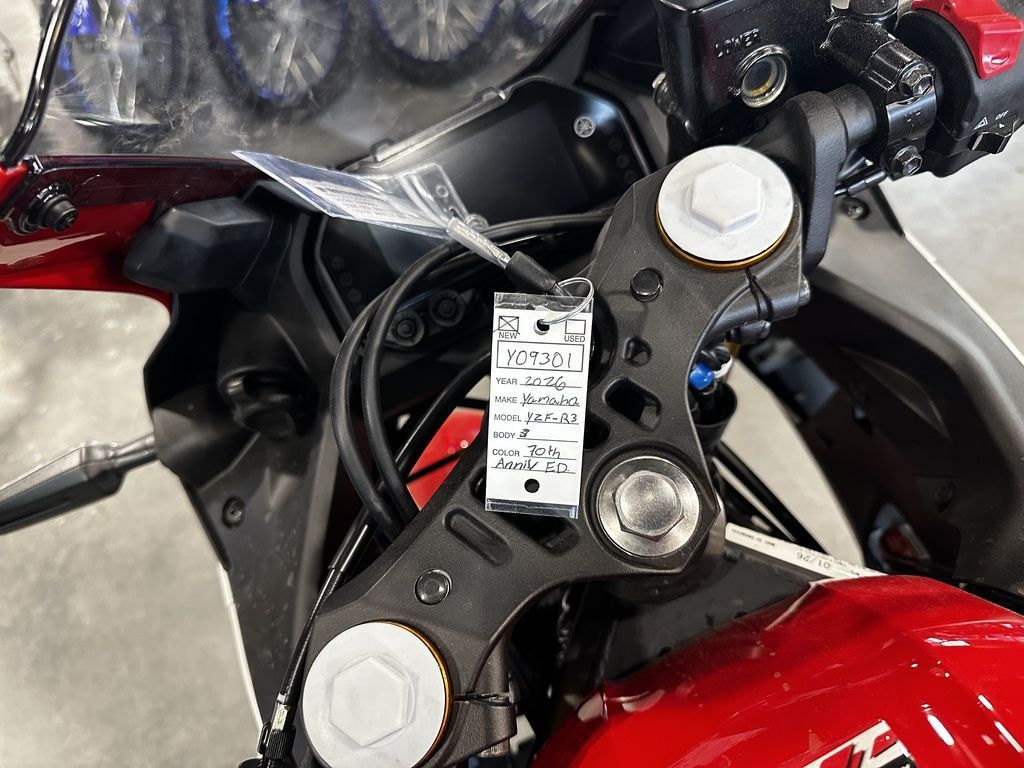 2026 Yamaha YZF-R3R WORLD IS CALLINGYamaha's celebrated entry into R World, the YZF-R3 is powered by a high-revving 321cc engine with an emphasis on lightweight, nimble handling and real-world practicality. A perfect choice for everyone from beginning riders to experienced track day enthusiasts, the R3 strikes the right balance of thrilling Supersport performance and everyday comfort in a fun, sporty package that shows off its distinctive R-Series pedigree from every angle.Features may include:Next Generation R-Series StylingInspired by the flowing aerodynamics of Yamaha's YZR-M1 MotoGP® race bike, the 2026 YZF-R3's distinctive R-Series pedigree is recognizable at a glance with its aggressive front fairing, sleek side panels and a sporty tail section with signature R-series tail wing.Iconic 70th Anniversary Edition StylingCelebrate seven decades of motorsports excellence with the 2026 YZF-R3 70th Anniversary Edition. Throwback white and red speed block livery, gold Yamaha Tuning Fork emblems, and Anniversary Edition badge combine with the R3's sleek, modern R-Series design to commemorate the 1955 birth of Yamaha Motor Company in standout style.Modern LED LightingAdvanced LED lighting adds a modern look, including a single projector-type headlight flanked by four-element position lights, along with LED tail lights and turn signals.Smartphone ConnectivityThe 2026 YZF-R3 features Yamaha Motorcycle Connect (Y-Connect) smartphone connectivity which works in conjunction with the free-of-charge Y-Connect app (available for iOS and Android) to enable a direct connection between motorcycle and smartphone. Y-Connect capability for the R3 includes the ability to view incoming call, email and message notifications. Additional useful functions include monitoring and notifying the rider or other contact of motorcycle technical issues, and also the ability to track and record key motorcycle ride data within the app, including distance covered, fuel consumption, acceleration, motorcycle location and much more.LCD Instrument DisplayAn LCD instrument cluster displays connected smartphone information along with vital vehicle data. There is also a USB-A socket located next to the display providing convenient power for phone charging or heated gear.Advanced Assist & Slipper ClutchThe Assist & Slipper clutch utilizes an assist cam and slipper cam to help inhibit excessive engine braking for a smooth, easy-to-handle feeling during downshifts while also reducing the amount of force required to pull the clutch lever for less hand fatigue.