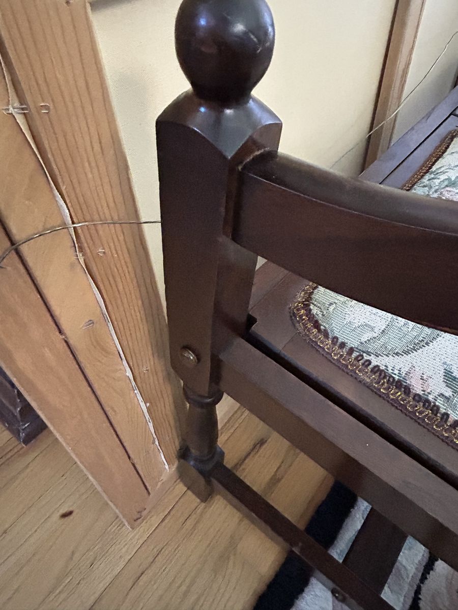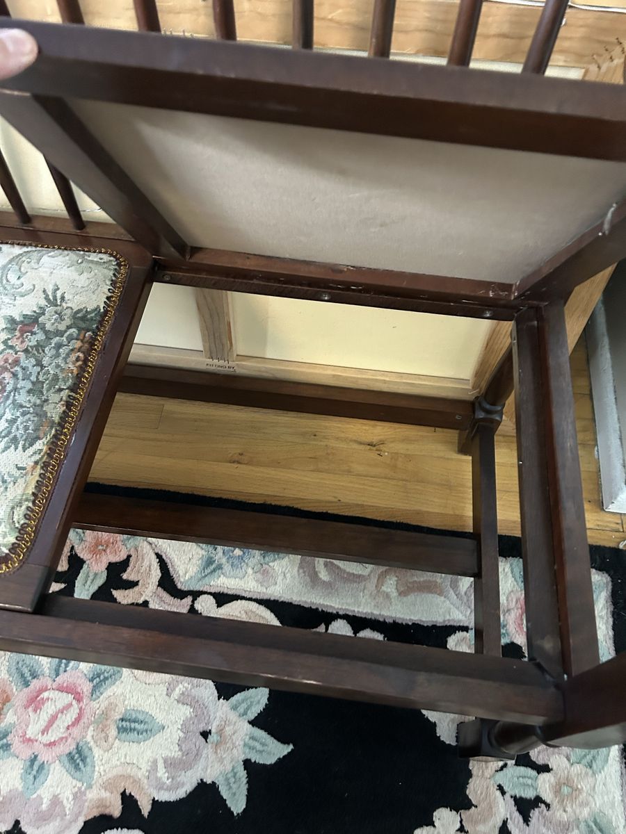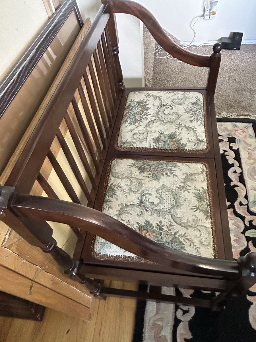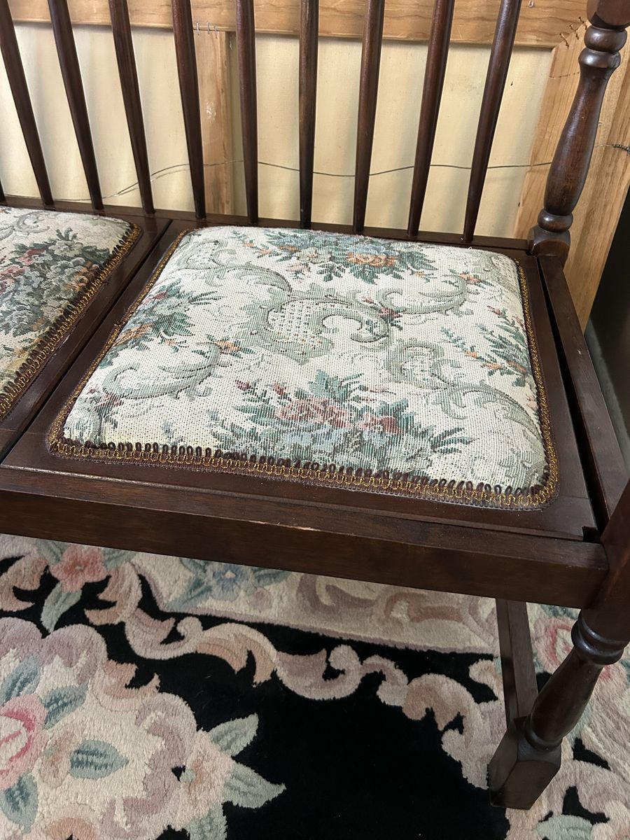 VenmoBeautiful Spindle Back Settee Floral Upholstered Bench Vintage Solid Cherry Love Seat-High Quality Heirloom Furniture, all original. Cash or Venmo only.
