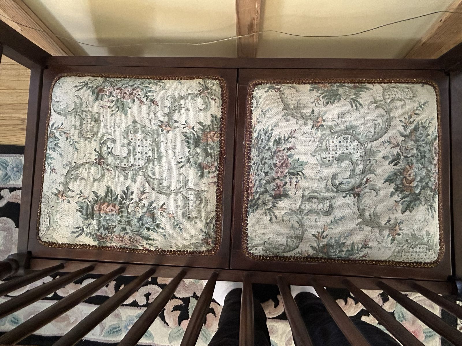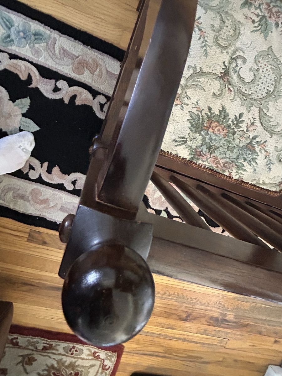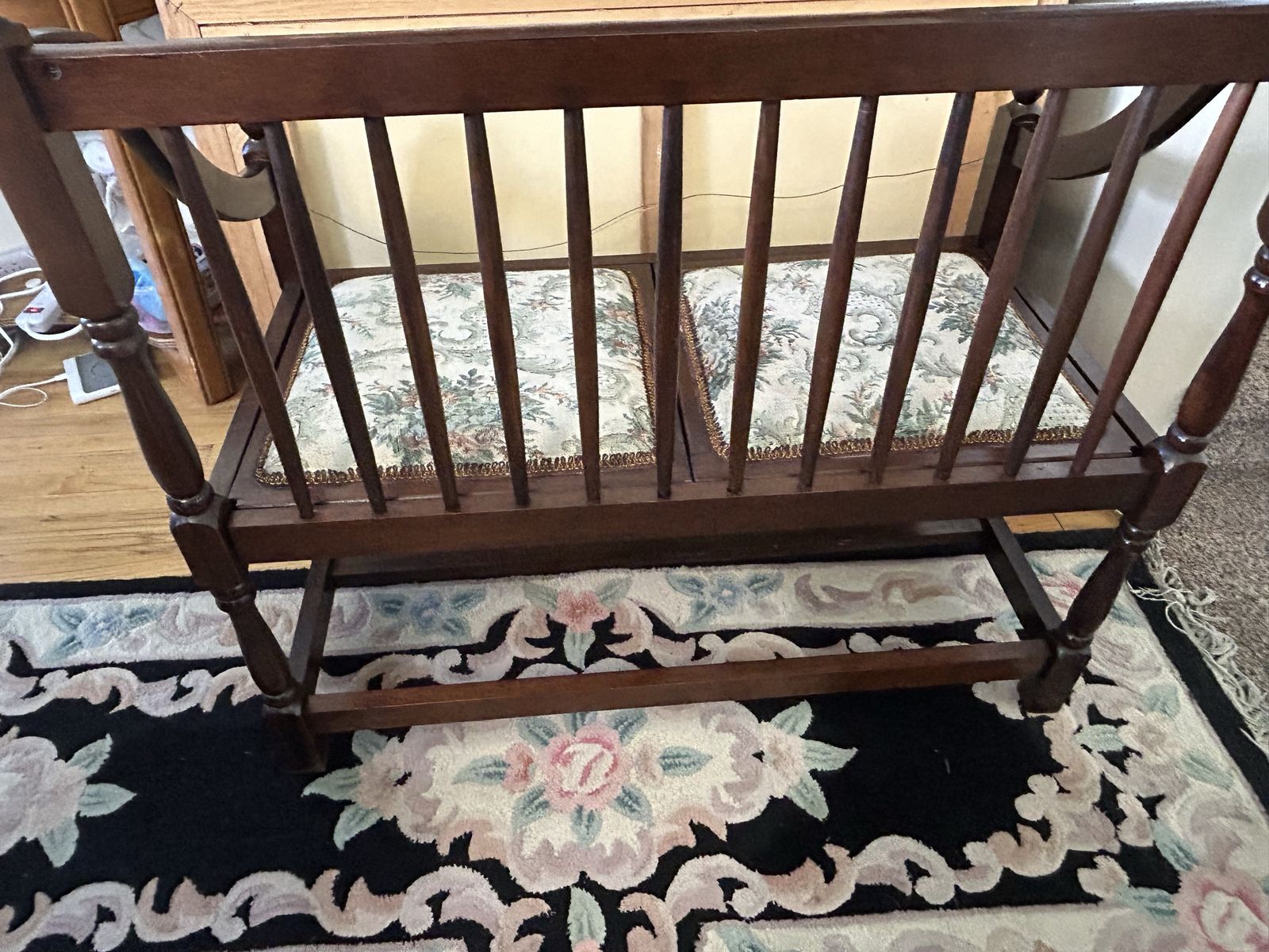 VenmoBeautiful Spindle Back Settee Floral Upholstered Bench Vintage Solid Cherry Love Seat-High Quality Heirloom Furniture, all original. Cash or Venmo only.