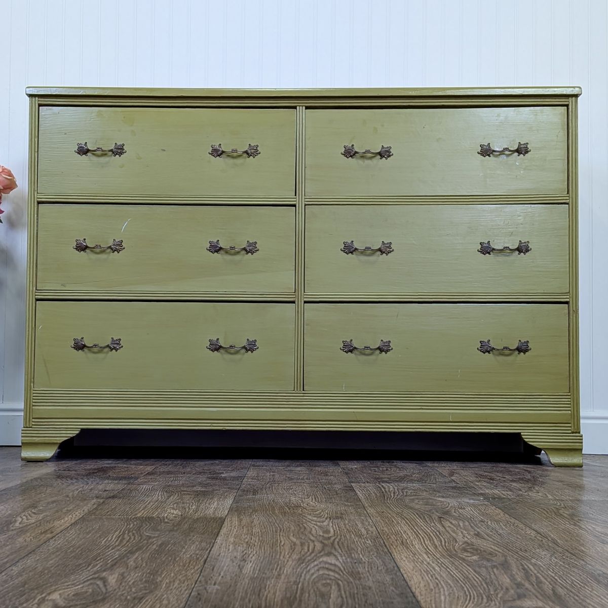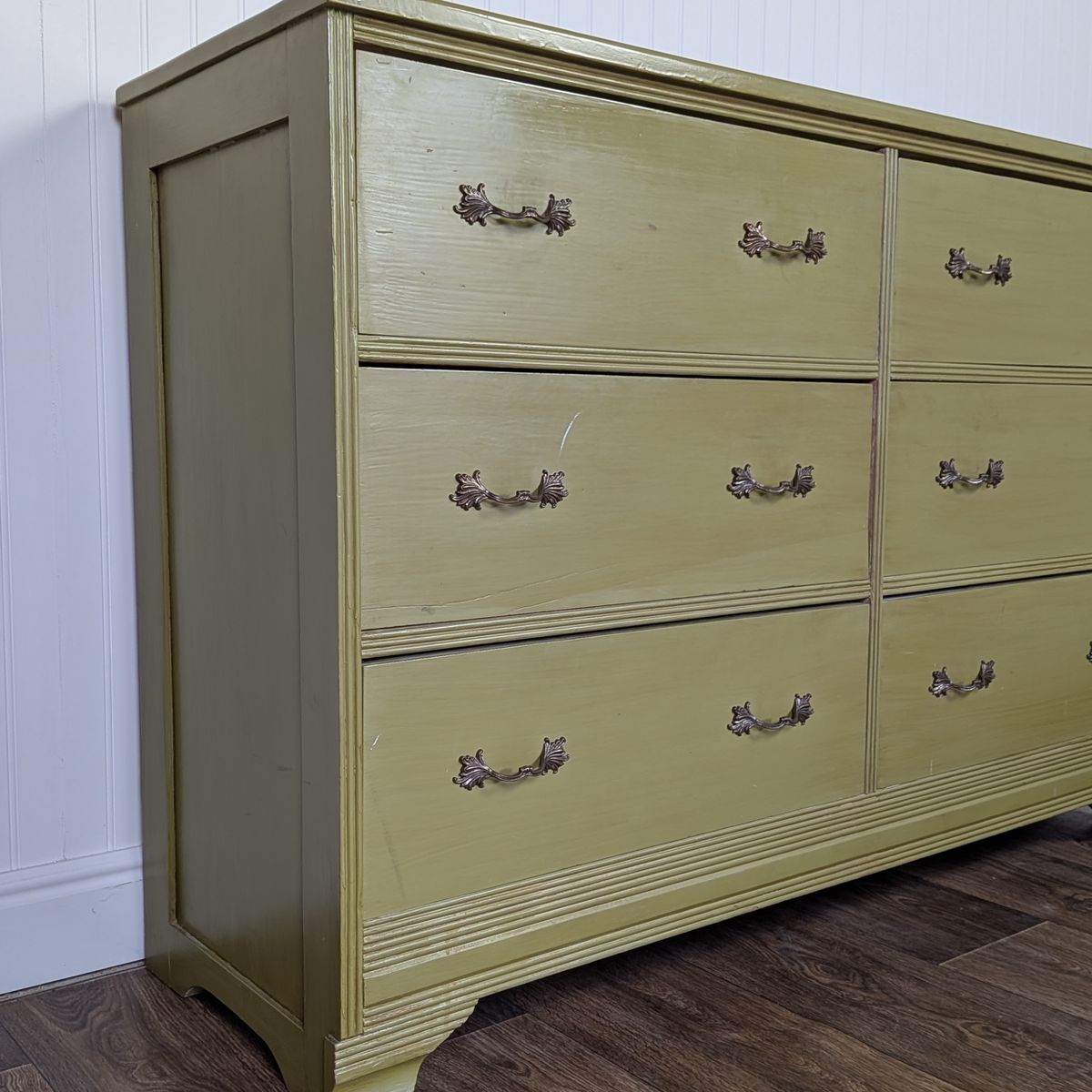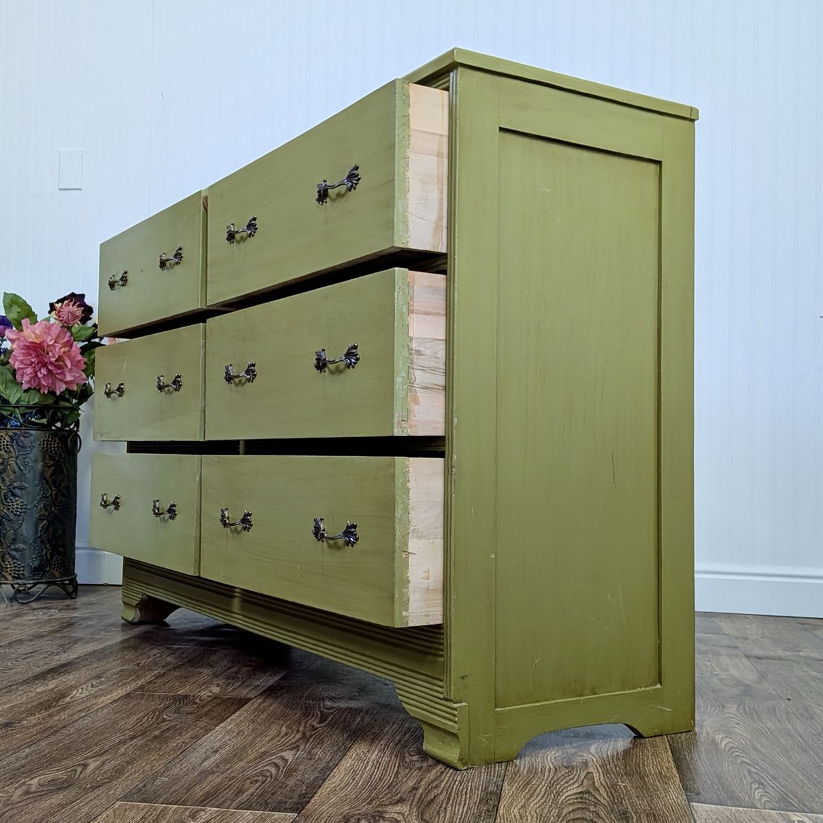 VenmoUnique vintage six-drawer dresser by Rodgers-Wade Manufacturing Co. featuring solid wood construction, a custom green finish, elegant reed-textured trim along the base, and ornate brass hardware. This solid piece showcases classic mid-century design with clean lines and charming bracket feet.