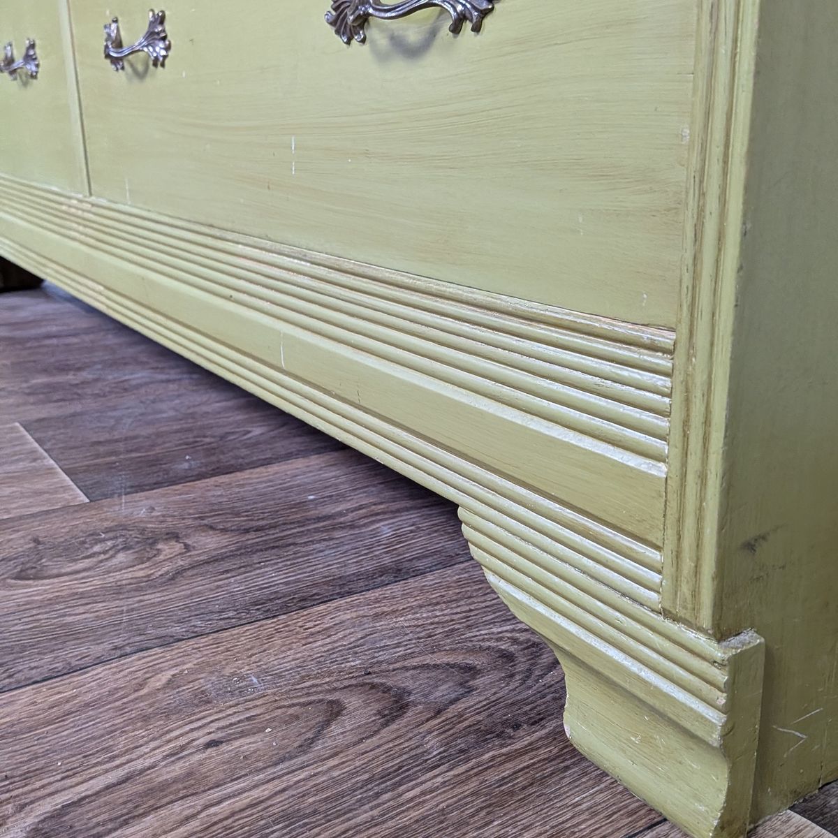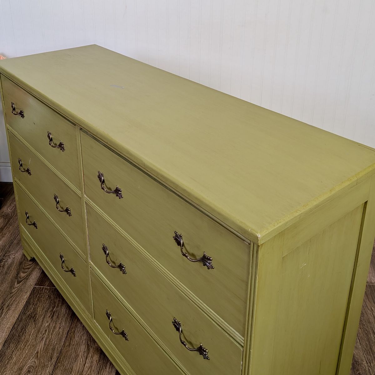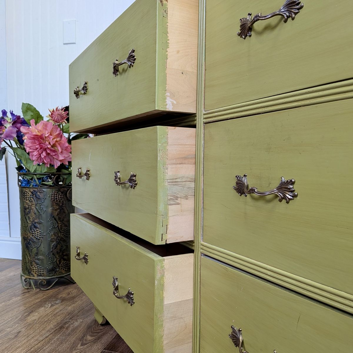 VenmoUnique vintage six-drawer dresser by Rodgers-Wade Manufacturing Co. featuring solid wood construction, a custom green finish, elegant reed-textured trim along the base, and ornate brass hardware. This solid piece showcases classic mid-century design with clean lines and charming bracket feet.
