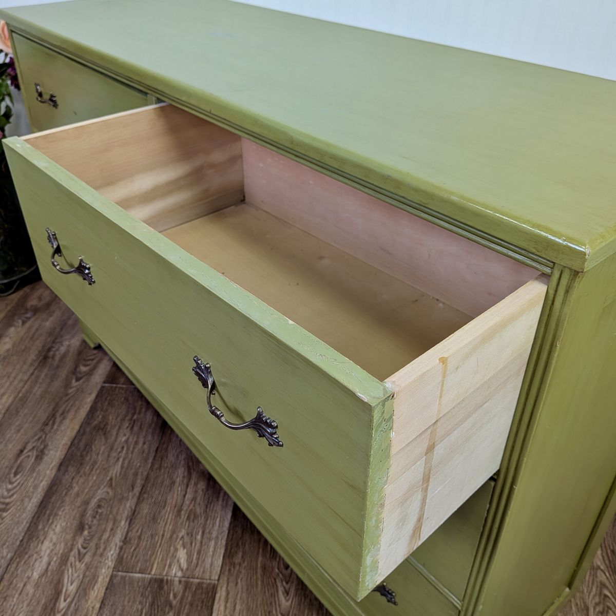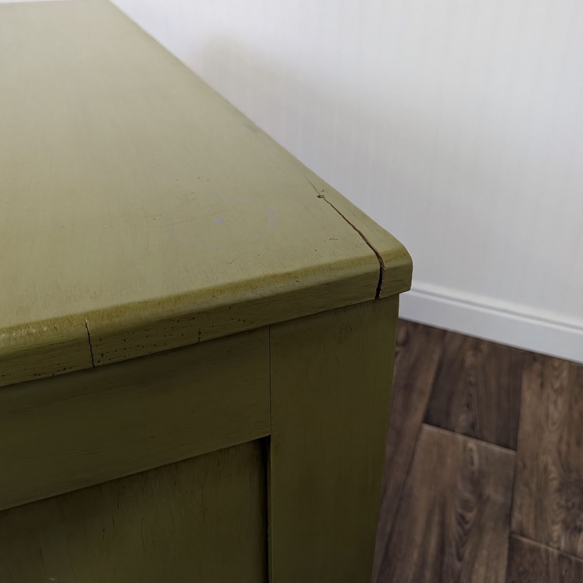 The dresser includes six spacious drawers made with dovetailed joinery. Please note there is some minor cosmetic wear to the finish, as shown in the photos, which adds to its authentic vintage character. Would with well in cottagecore, grandmillenial, or shabby chic spaces.