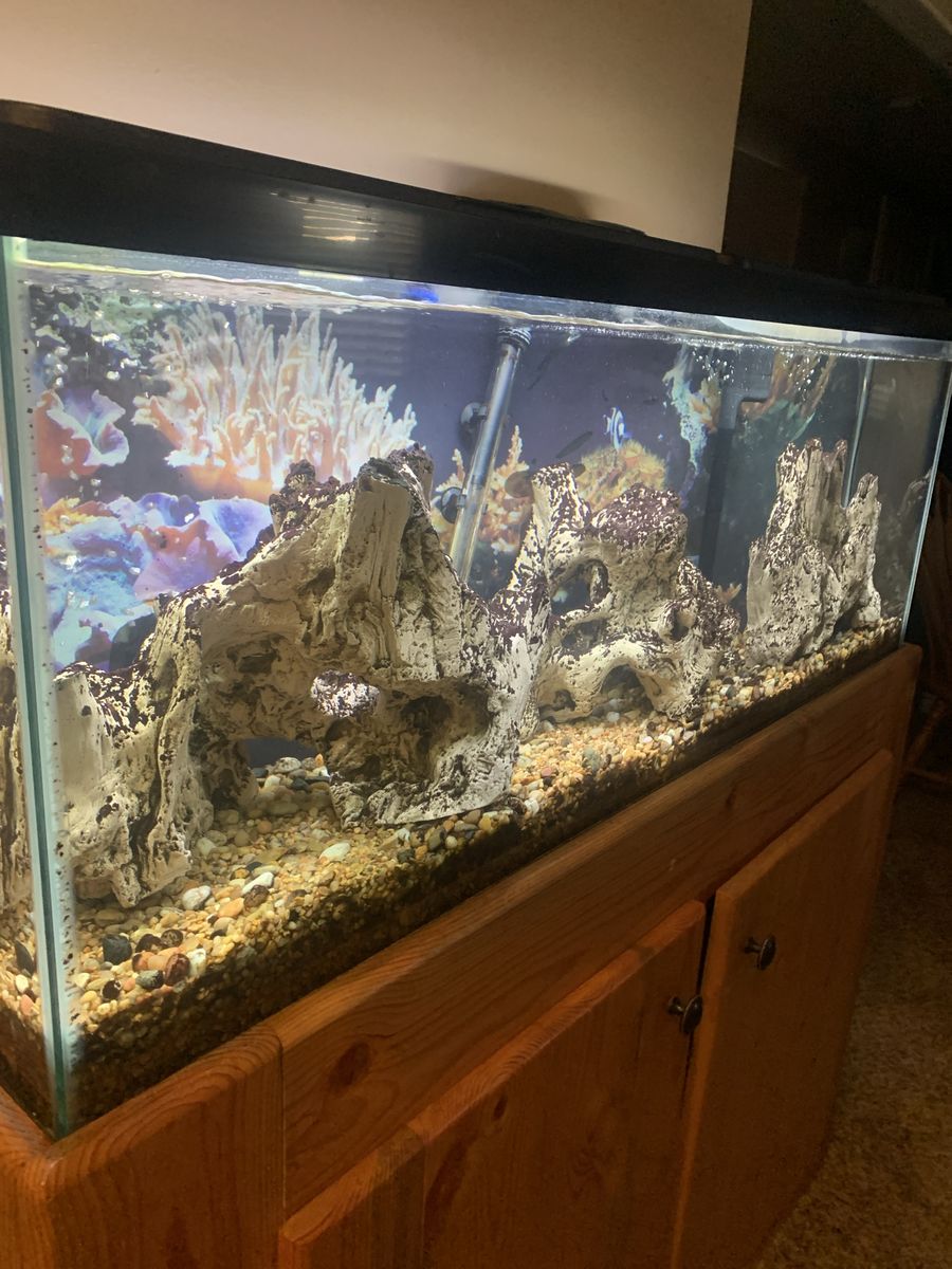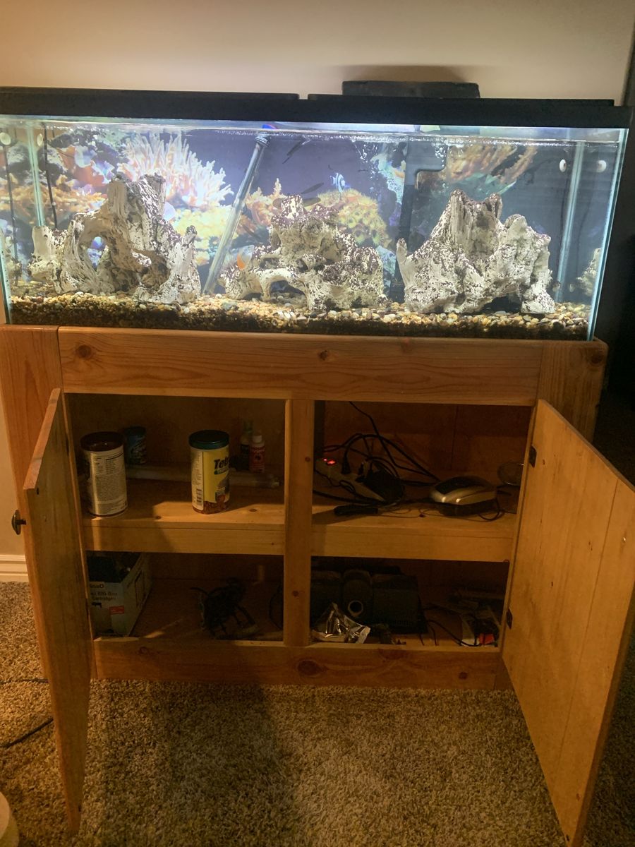 VenmoI believe it’s a 50 gallon tank. It is 48” wide by 18”high by 12” deep. It has been established for 15 years. Everything I have goes with it. Fish, rocks, filter, hood, cabinet stand, LED light with auto timerCome and get it.