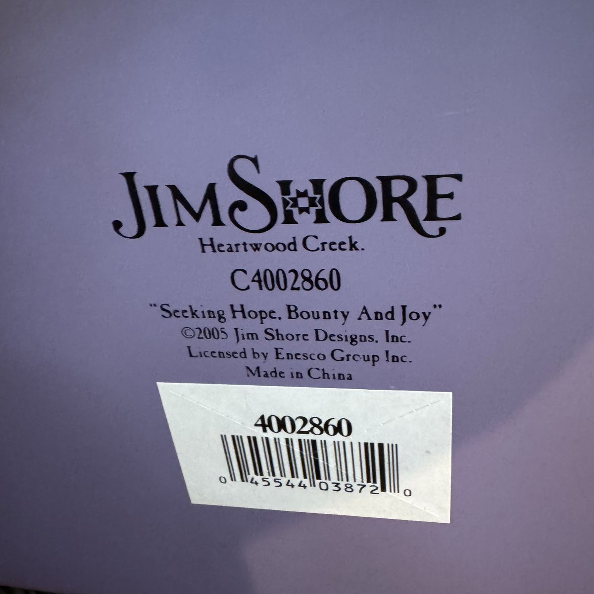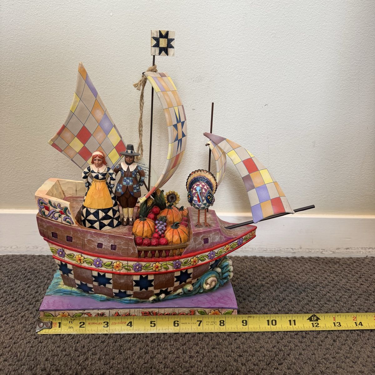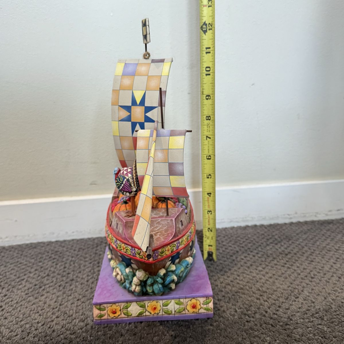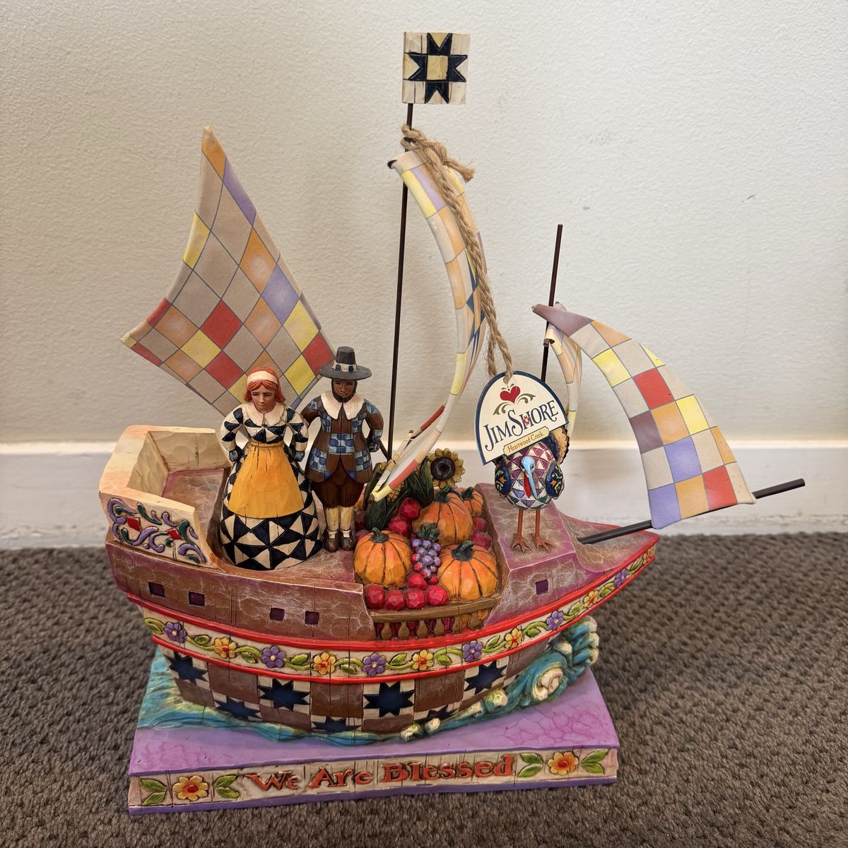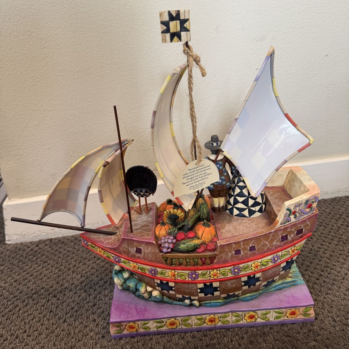 Jim Shore Heartwood Creek "Seeking Hope, Bounty and Joy" Pilgrims Ship figurine, also known as the "We Are Blessed" ship. Manufacturer: Manufactured by Enesco in 2005. Design: Features pilgrim figures on a boat surrounded by pumpkins and harvest fruits, designed in Jim Shore's signature folk art style with quilt patterns. Material: Made of stone resin. Theme: Thanksgiving or Harvest-themed home decor