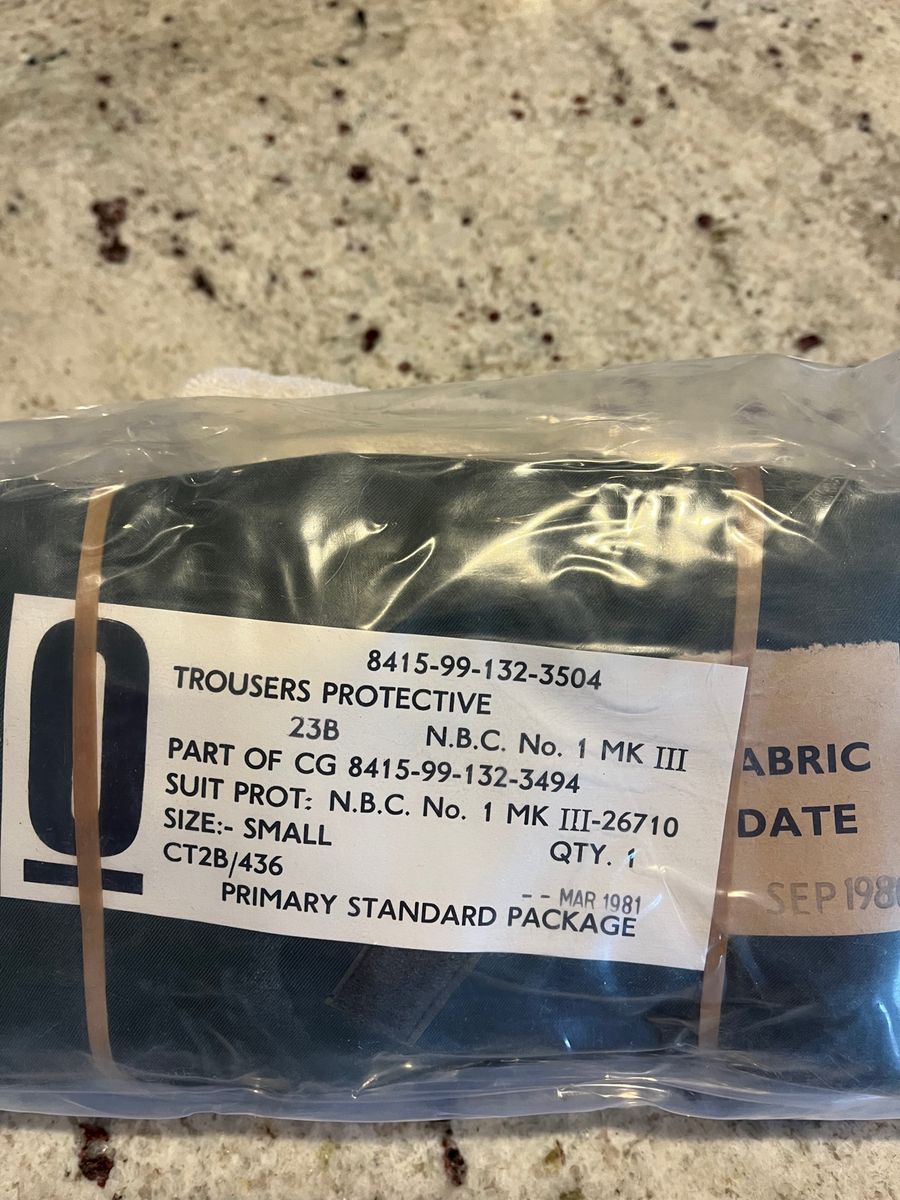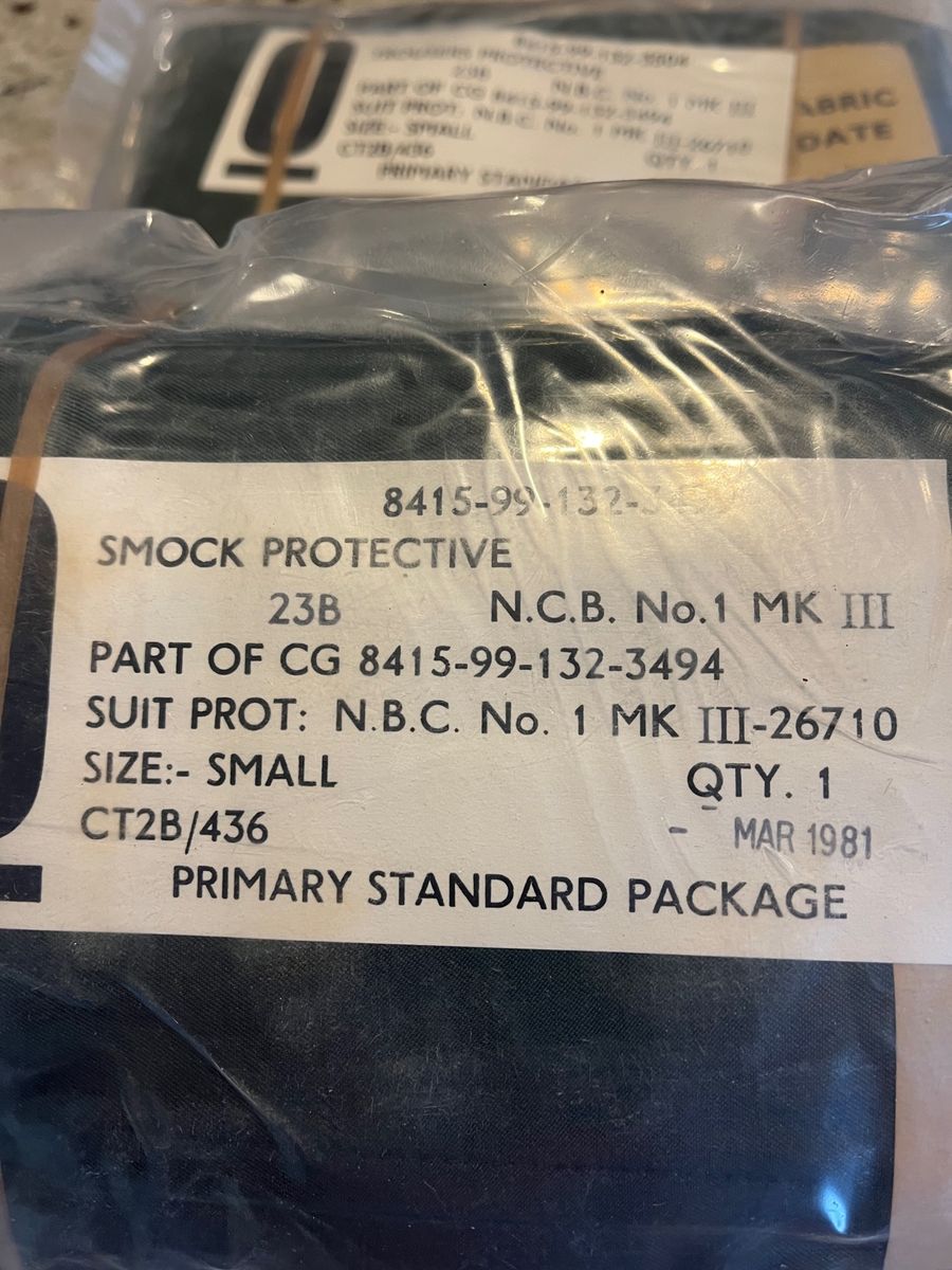 ZelleThis is US Military chemical protective N.B.C suit (Nuclear. Biological. Chemical) SMOK & Trousers. New Old Stock 1980 production still in the protective double plastic sealed wrap. Stock # 8415-99-132-3499 SMOK, 8415-99-132-3504 TROUSERS N.C.B MKIII Size Small. My research shows they are Chemical resistant, Fire resistant, Water repellant. I have Two sets of these for sale at $65.00 each set.