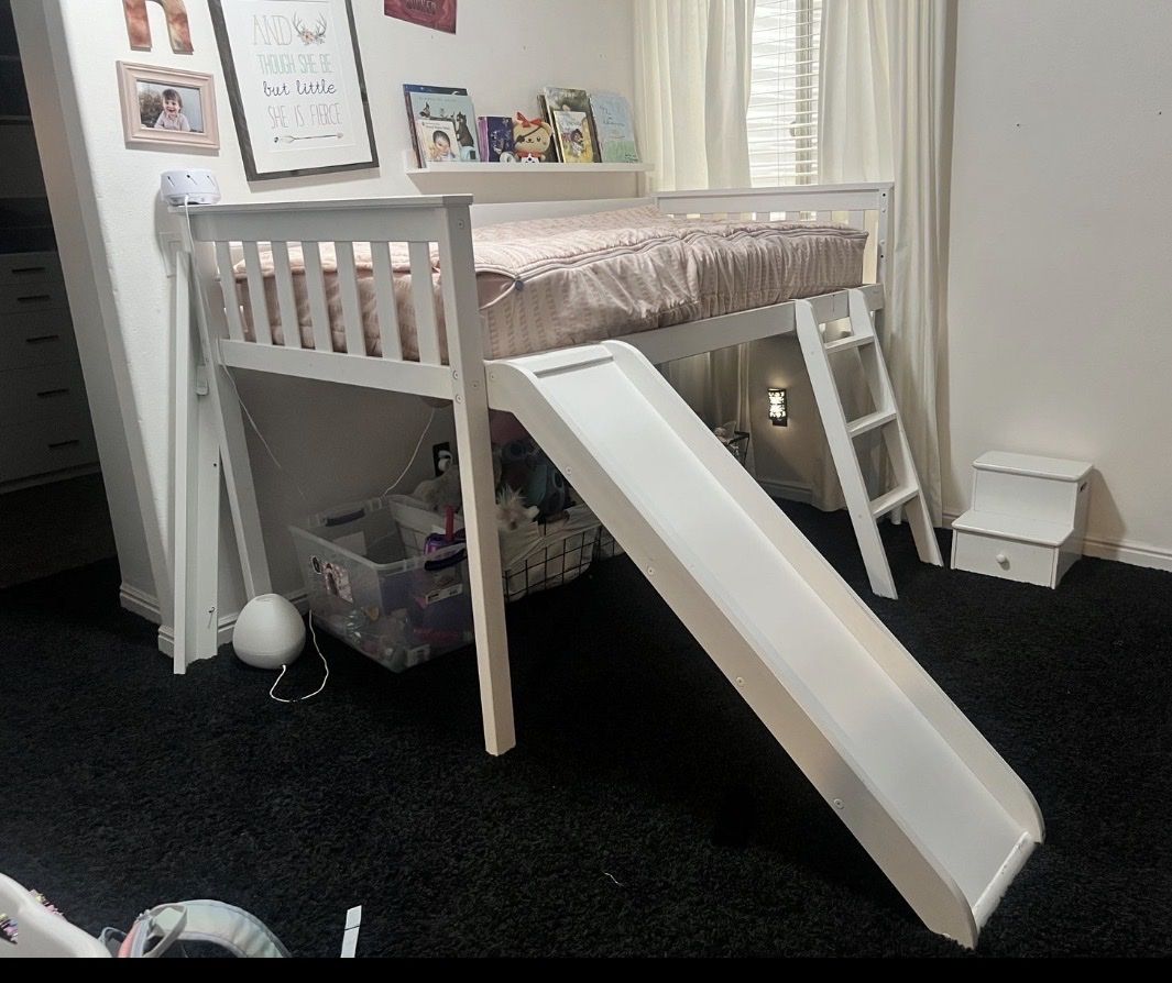 Super cute kids bed. Comes with slide, ladder, and side railing. In good shape, with some scraped up paint in some areas. Does not include the curtains pictured in the listing.