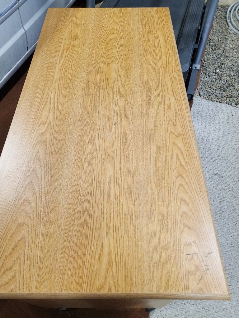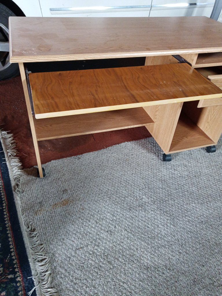 Wood laminate computer desk has pull-out keyboard platform, side drawer and lower shelves. Wheels allow for easy positioning.