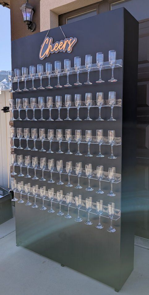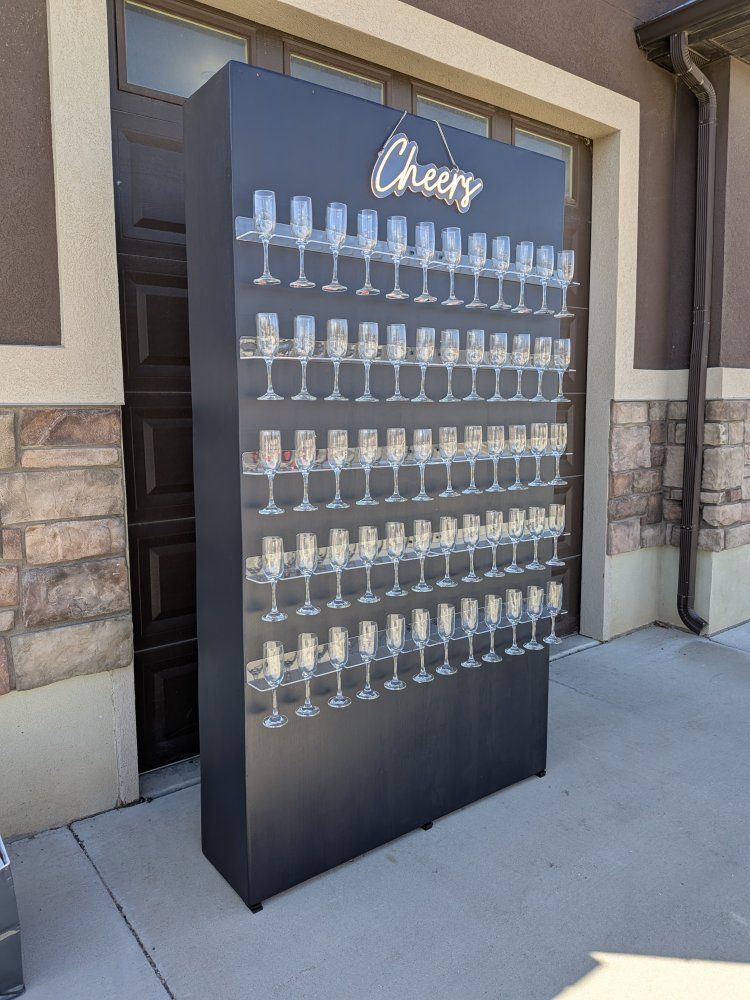 dimensions 7ft tall, 4ft wide, 10 inches deep. comes with 70 champagne glasses in carrying bags for easy transportation.