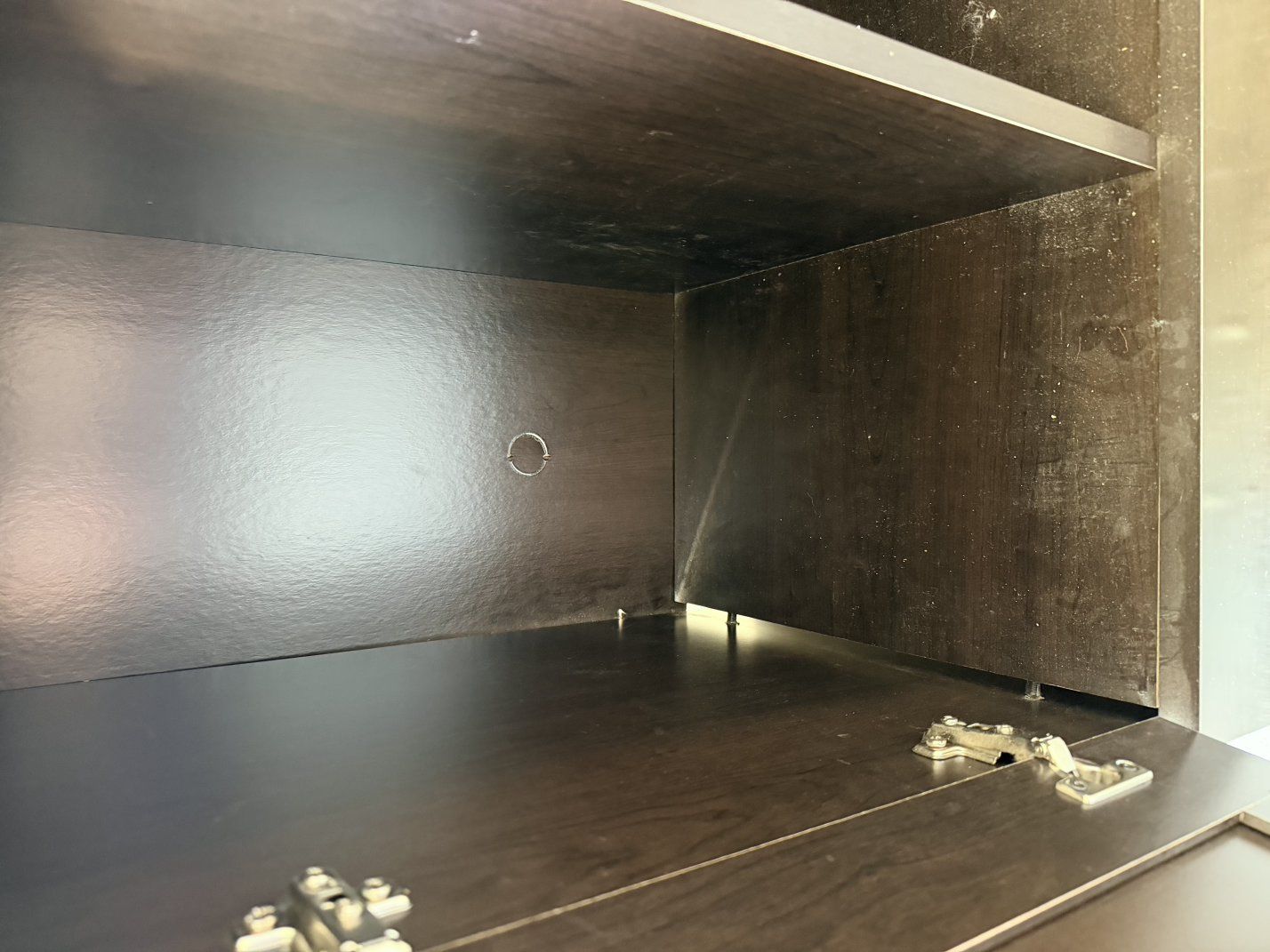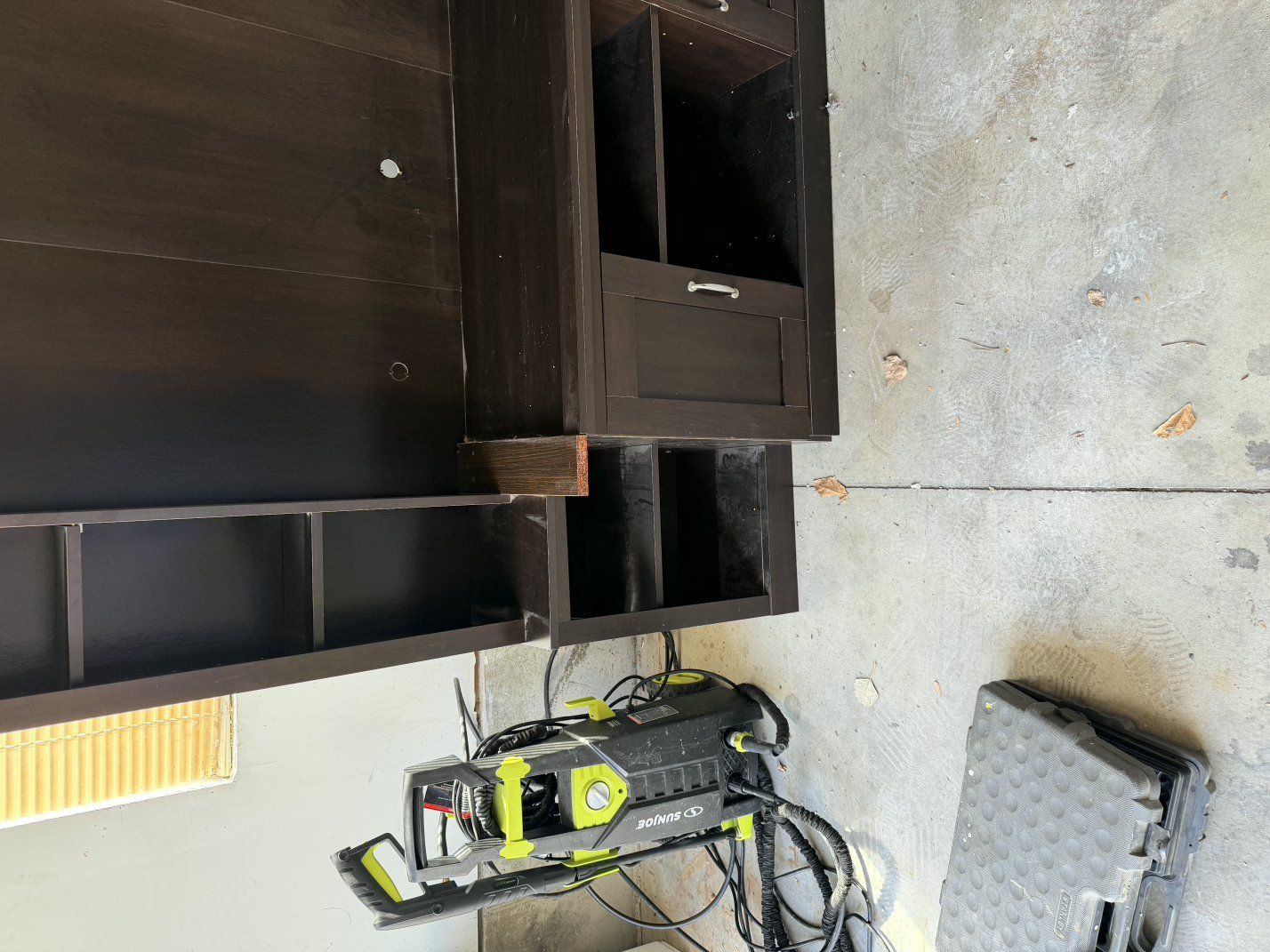 It is dusty and just needs to be wiped down, but it has a lot of life left! We did add extra boards to fit a 65 in TV on it. Ypu can unscrew them if you don't want them on. There is a gap that's always been there in one of the cabinets. It hasn't hindered anything though.