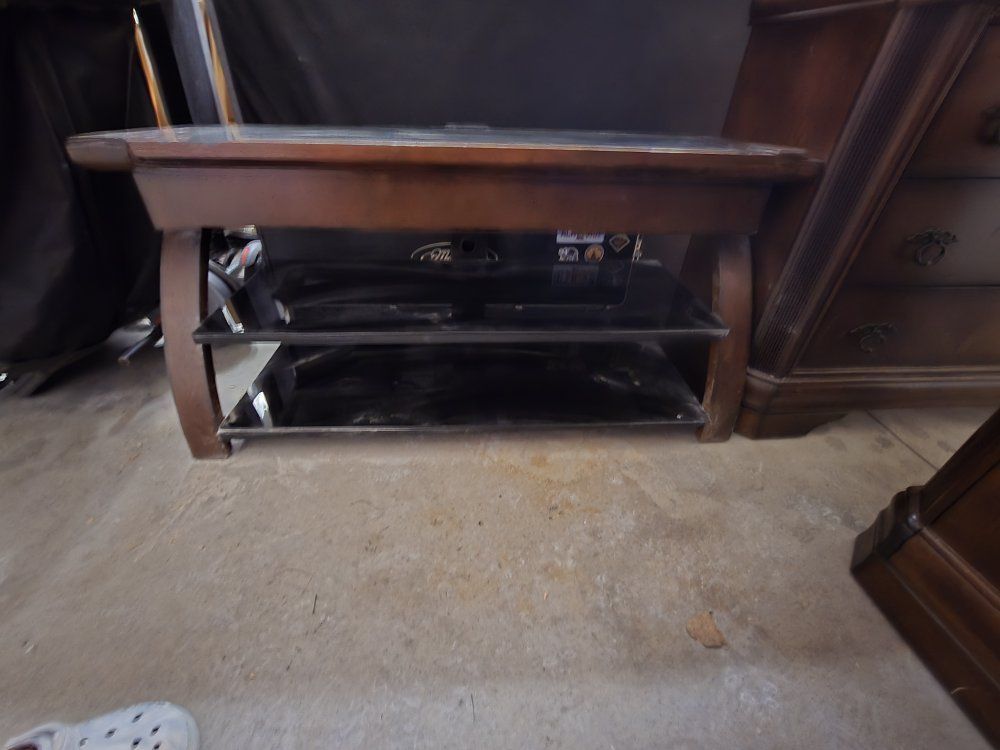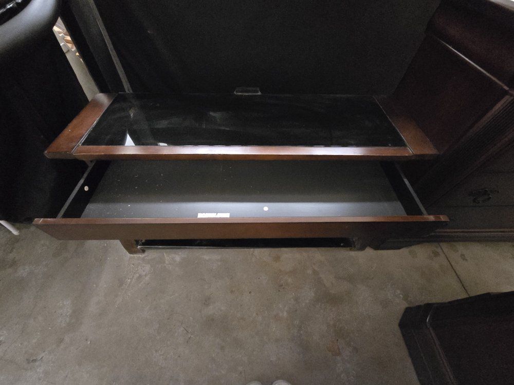 2 shelves and a drawer. It comes with tv mount that can attach to the back of the stand.