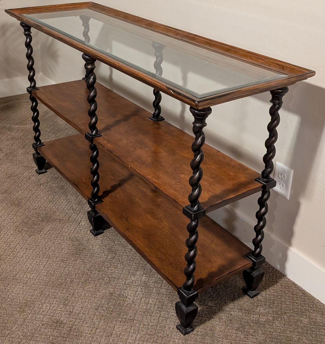 VenmoWood & glass table, 2 shelves. Spiral legs, metal 'feet'. 52" wide x 17" deep x 31 3/4" high