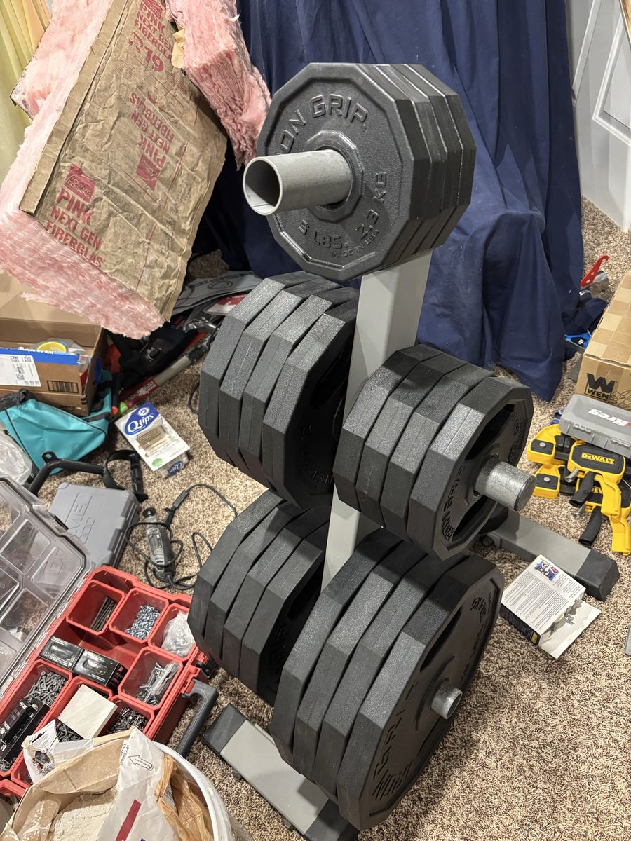 VenmoVery high quality weights. Basically brand new—perfect condition. Iron Grip Urethane coated Olympic style weight plates are originally $4 per pound plus shipping. Comes with the weight tree as well if wanted. Weights: 2 x 2.5 4 x 5 4 x 10 4 x 25 4 x 35 4 x 45