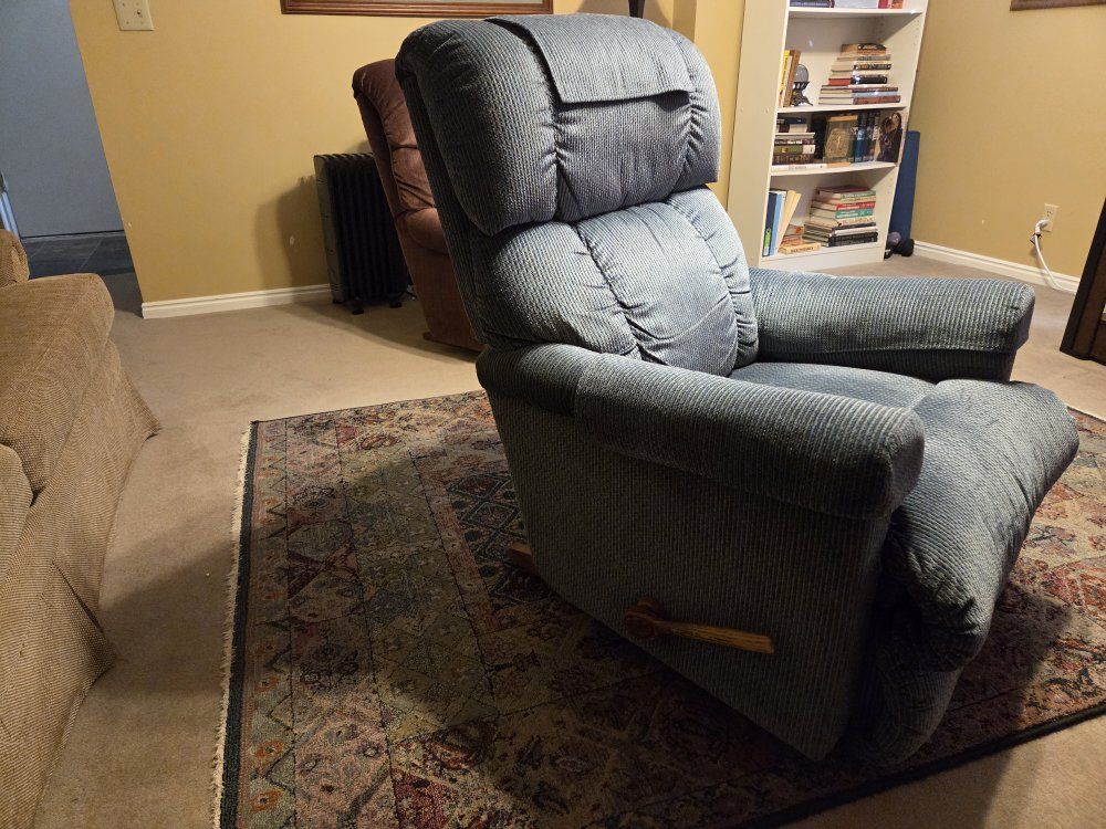 Comfortable blue recliner is going, to make room for new furniture.