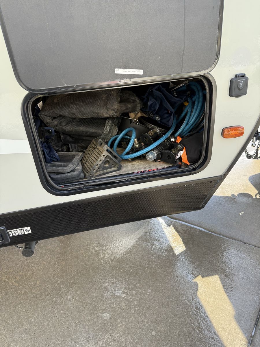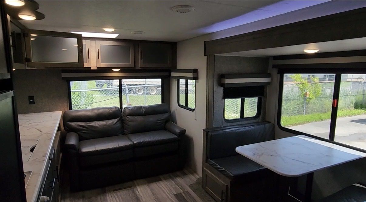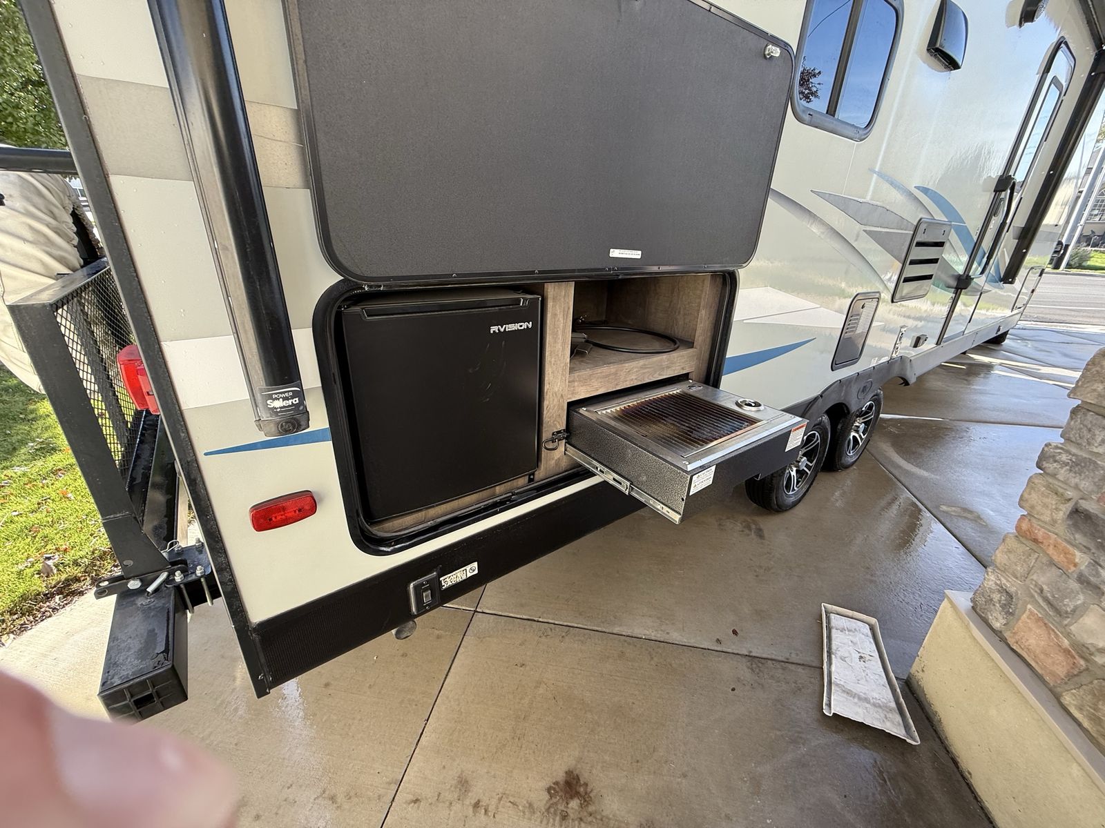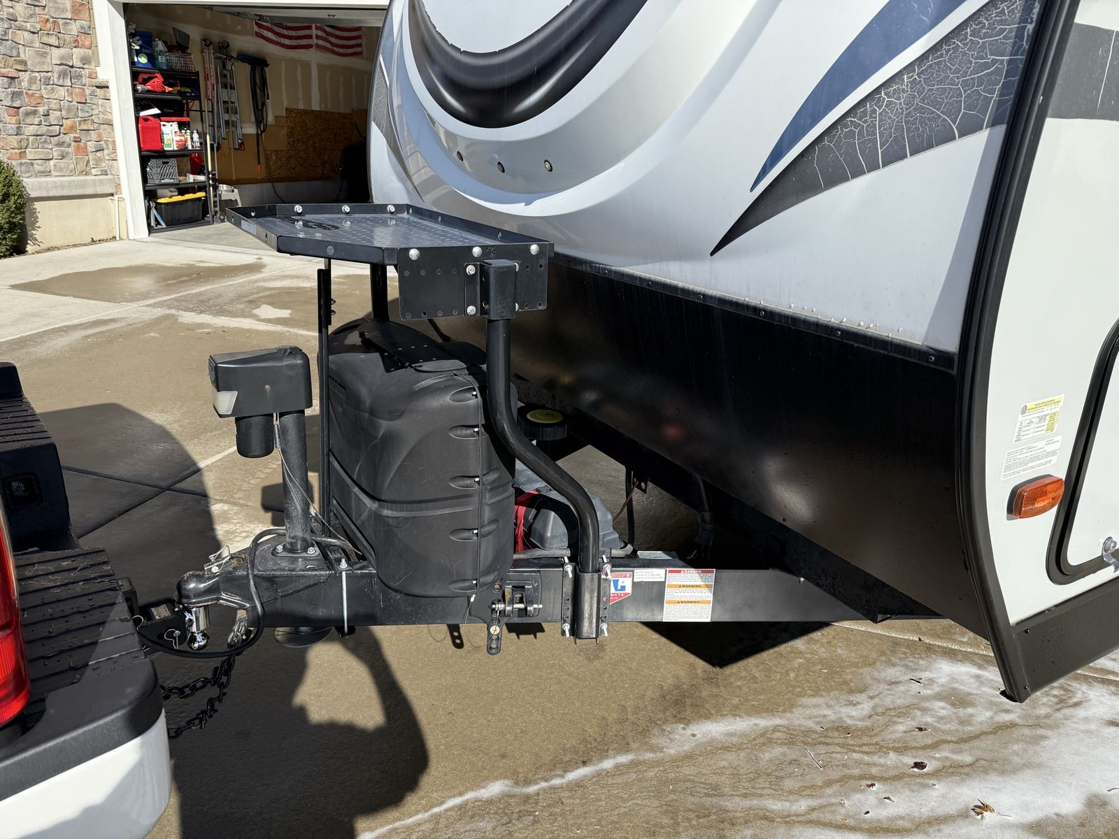 Upgrades Included: Roof-mounted solar panel with inverter Eaz-Lift ReCurve R3 10K Weight Distribution Hitch included EZ dual anti-sway stabilizer bars Electric tongue jacks Generator rack (above propane tanks) Briggs & Stratton P4500 Inverter Generator, gas-powered (Model 30795) Quick dual battery disconnect Exterior grill & fridge combo Power awning with LED lights