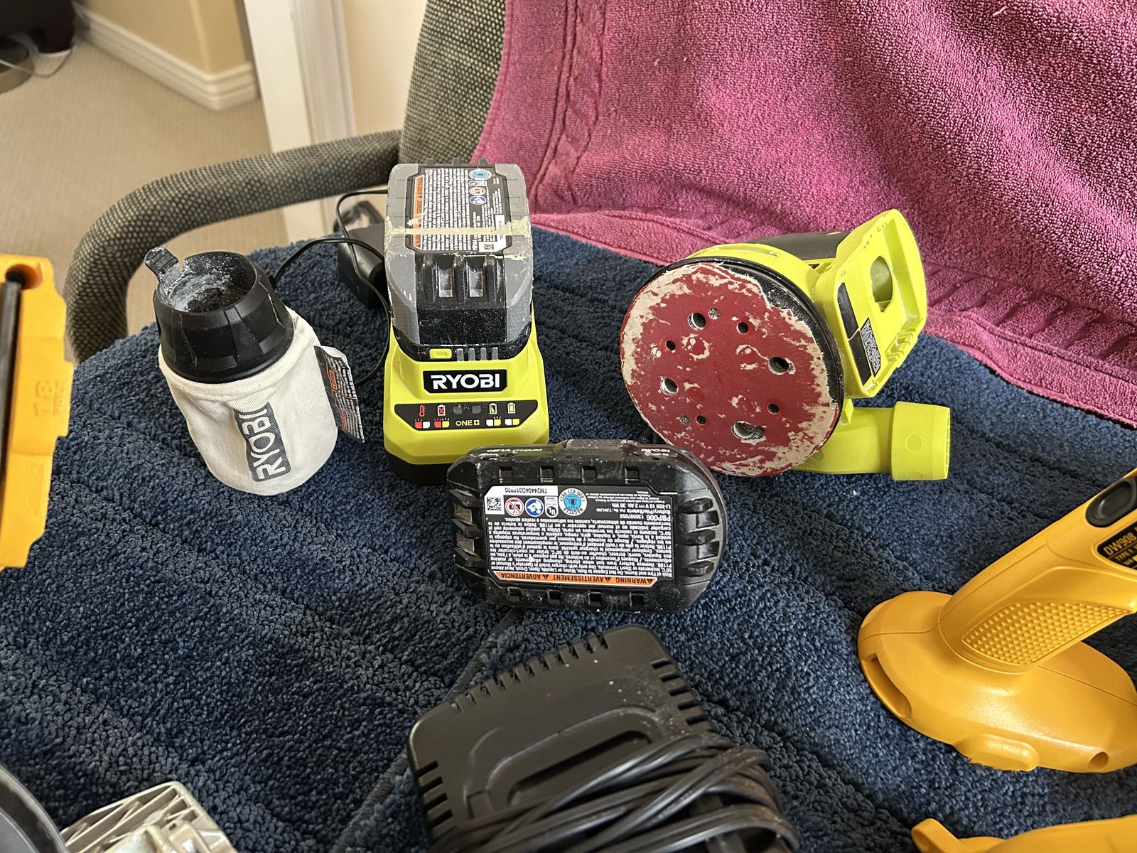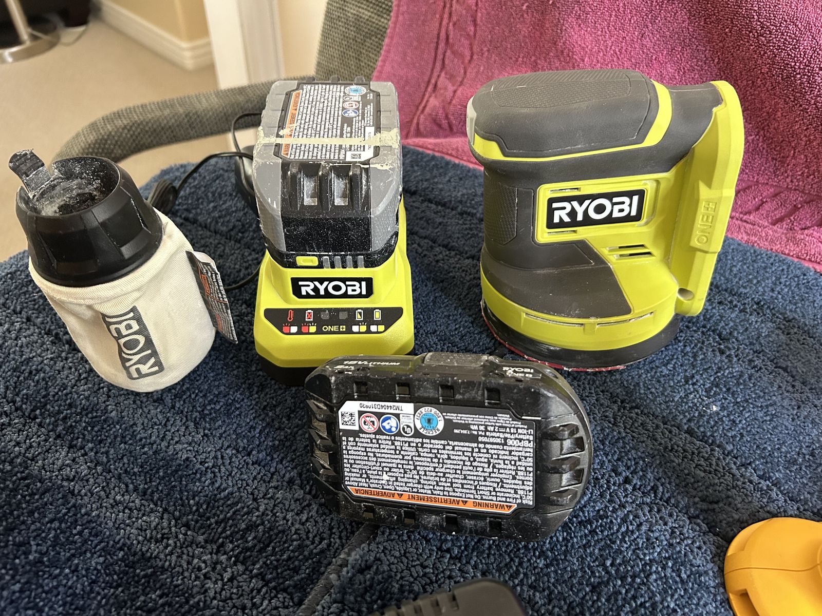 All power tools, accessories, batteries and chargers Included in the entire purchase: ( Total package includes RYOBI PCL 406 sander, batteries and charger)