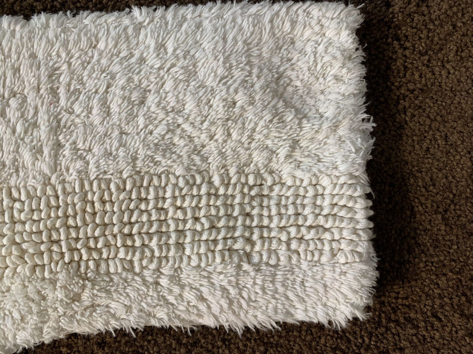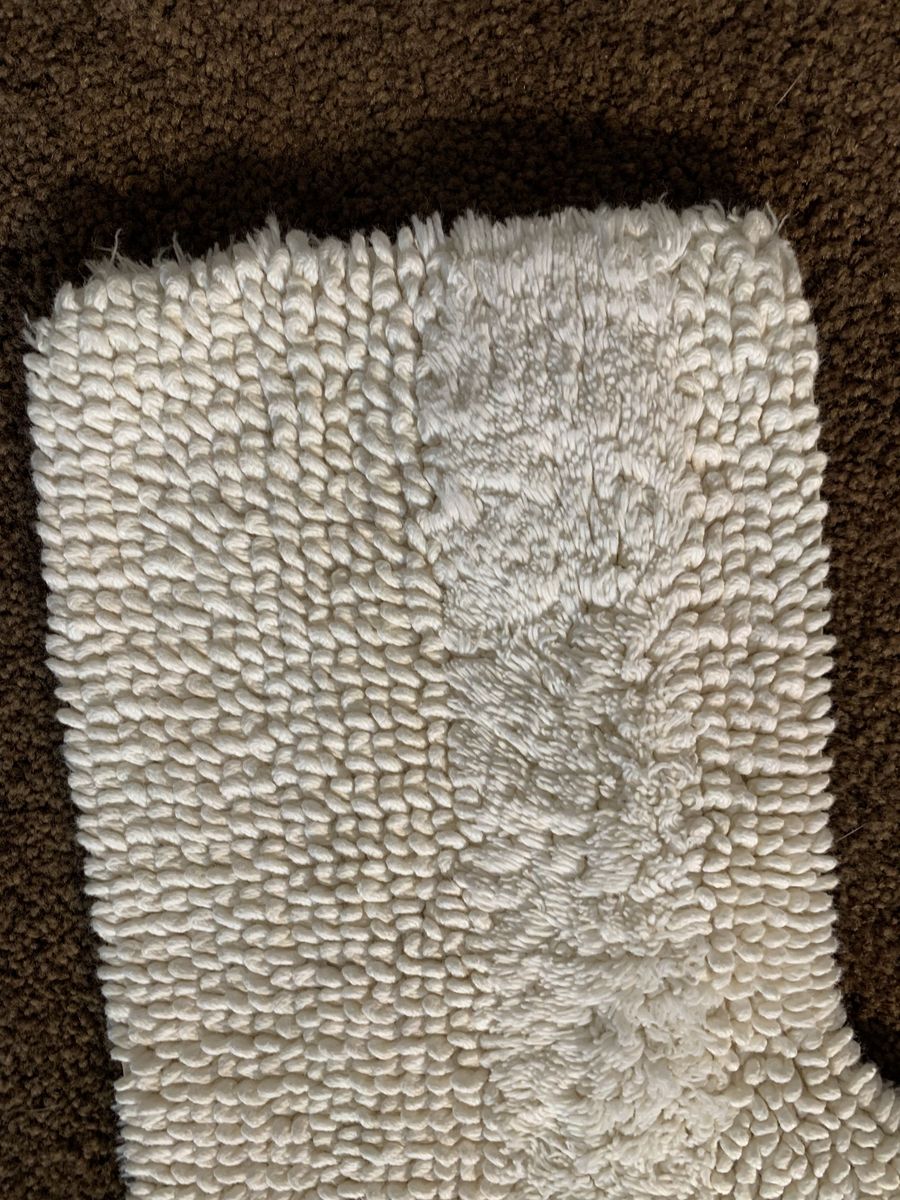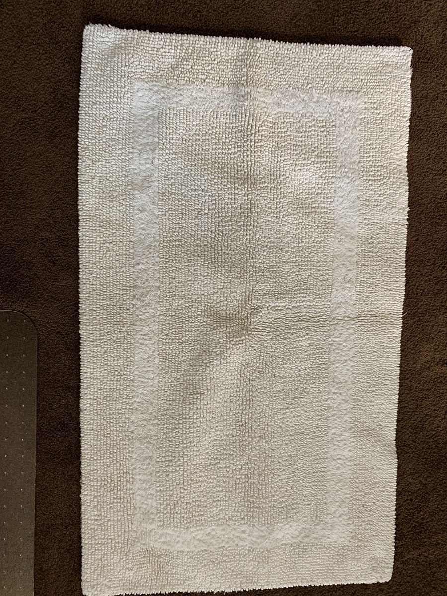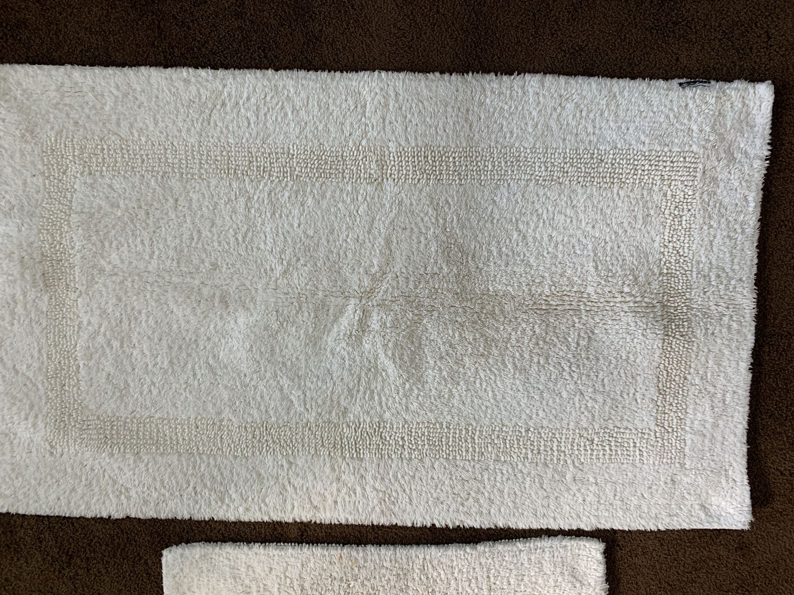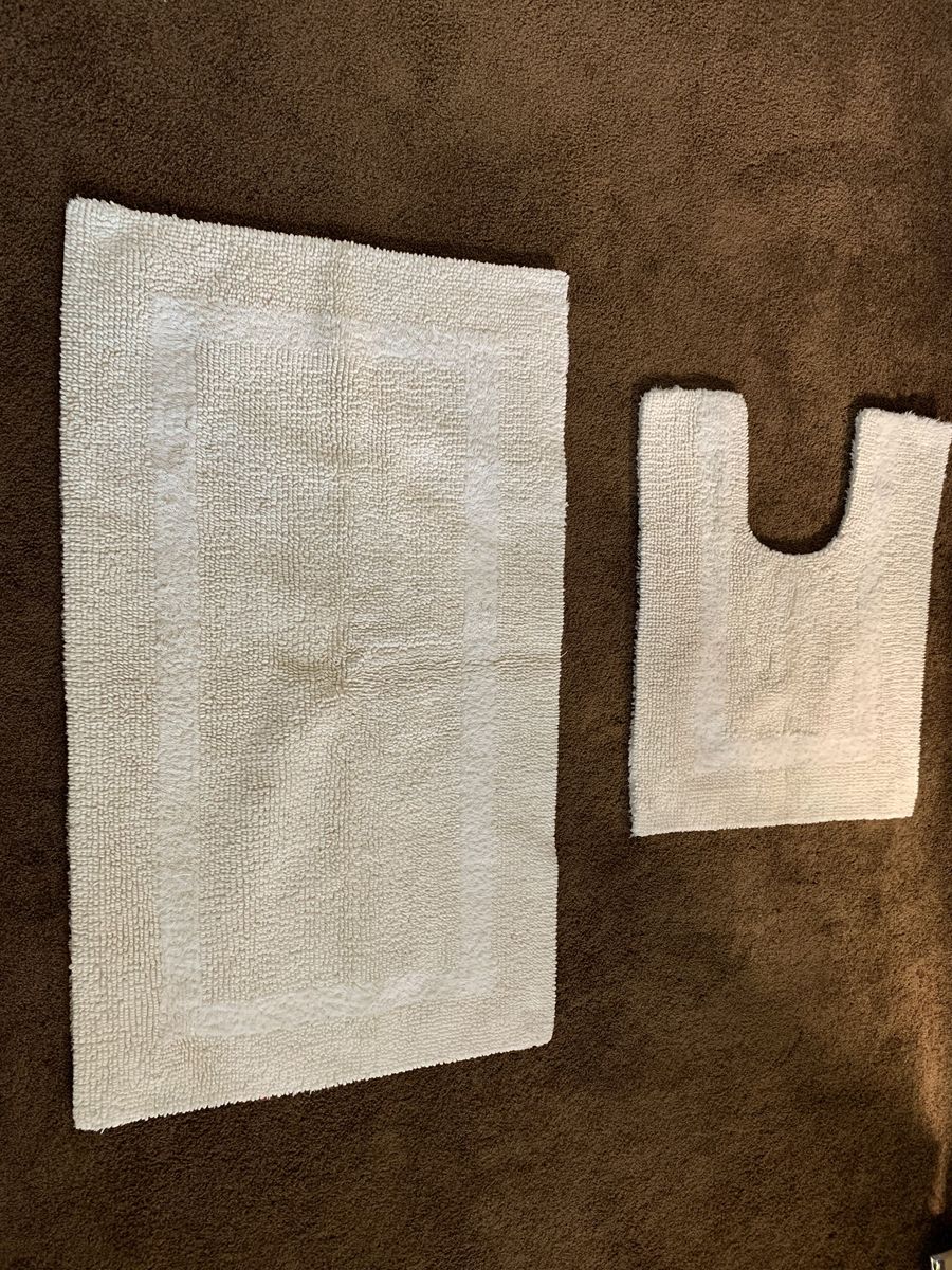 These are both reversible with slightly different patterns and textures on both sides. The large rectangular rug is 40" x 24" and the toilet rug is 24" x 20". They both are in good condition. I'm asking $15 for both.