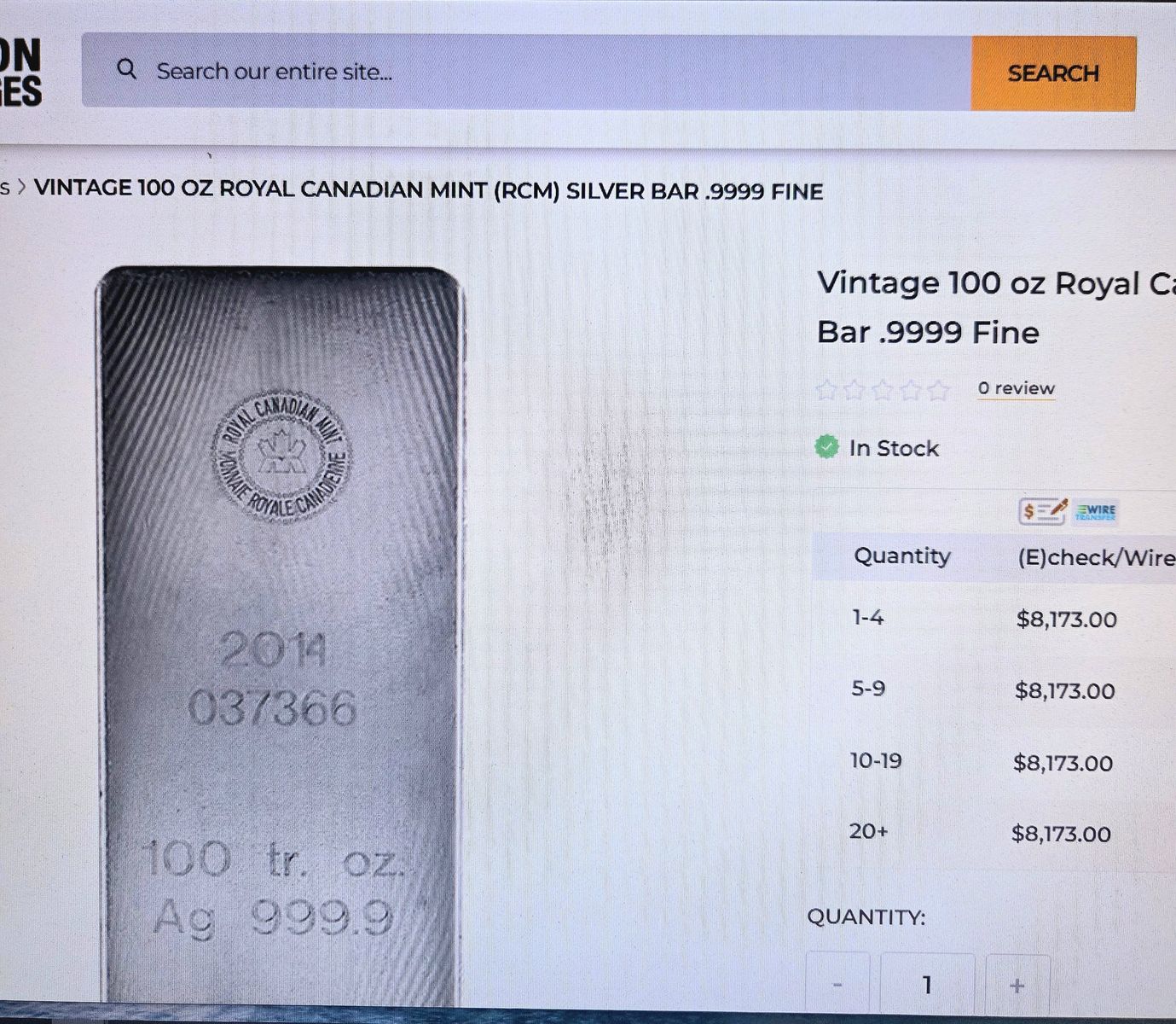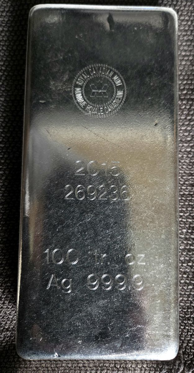 FOR SALE: RCM (Royal Canadian Mint) 100 oz. silver bar - .9999 fine with serial # - This beautiful bar of silver is 99.99% pure silver. RCM is one of a few refiners that achieves this degree of purity. RCM silver bars are 'highly sought after'.