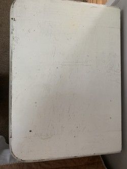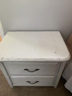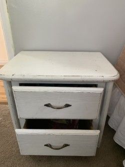 ZelleDstressed white two drawer night stand. Top has some discloration as seen in the pictures. Solid wood, sturdy construction