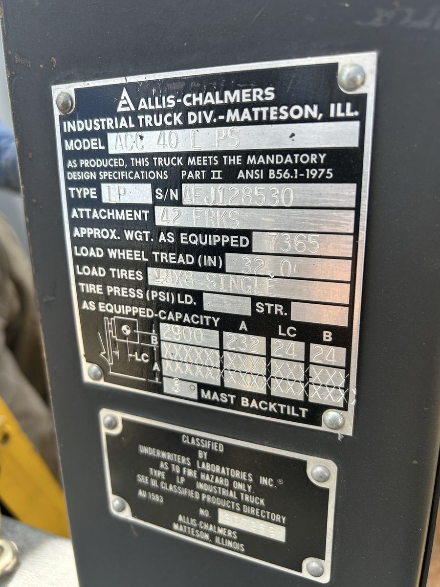 Allis Chalmers fork lift. Model ACC 40 L PS. SN J128530. Propane Runs