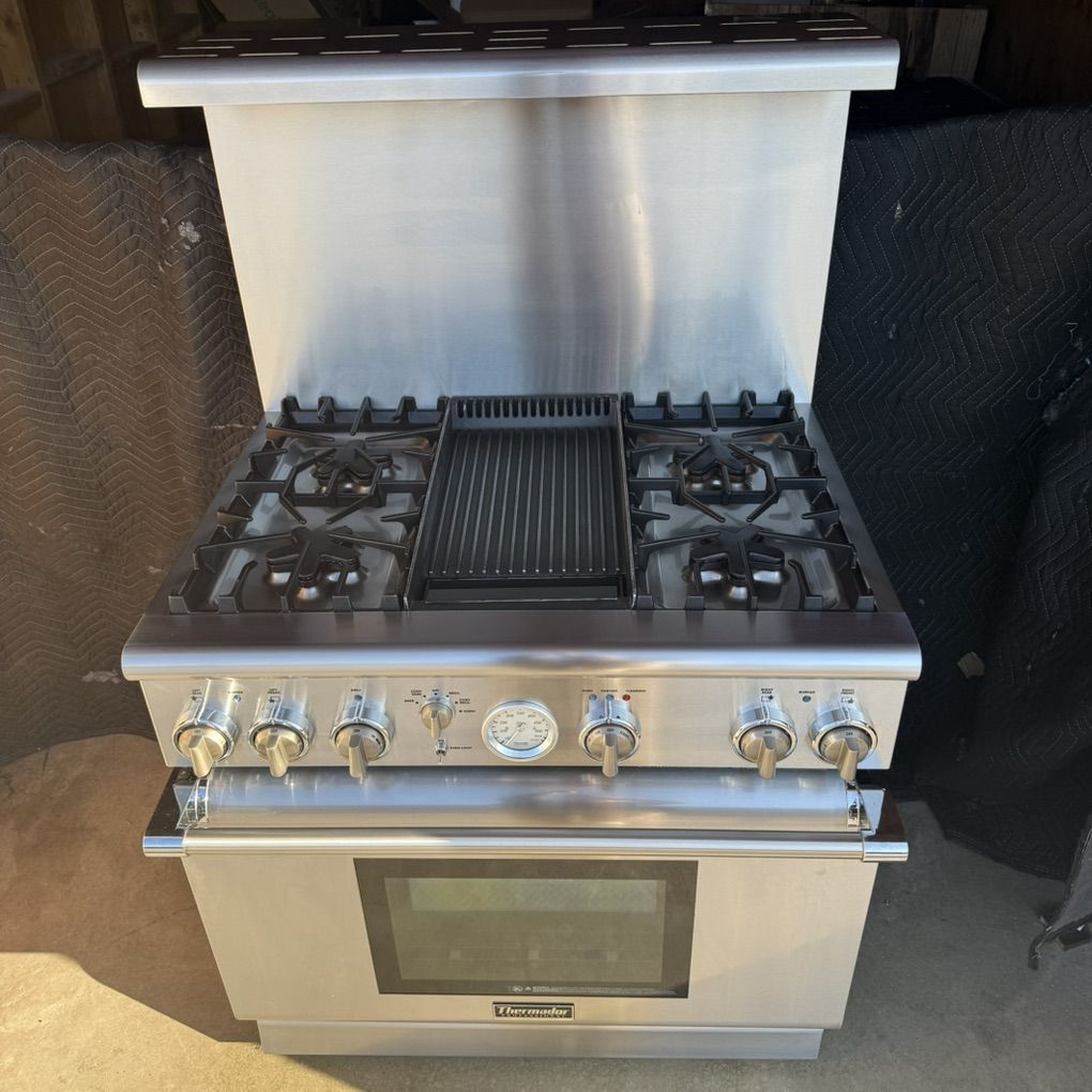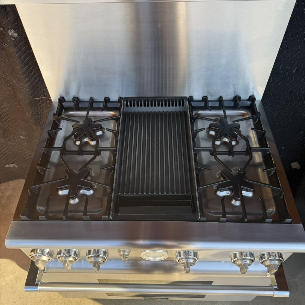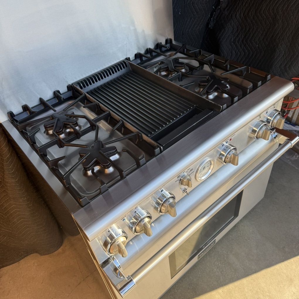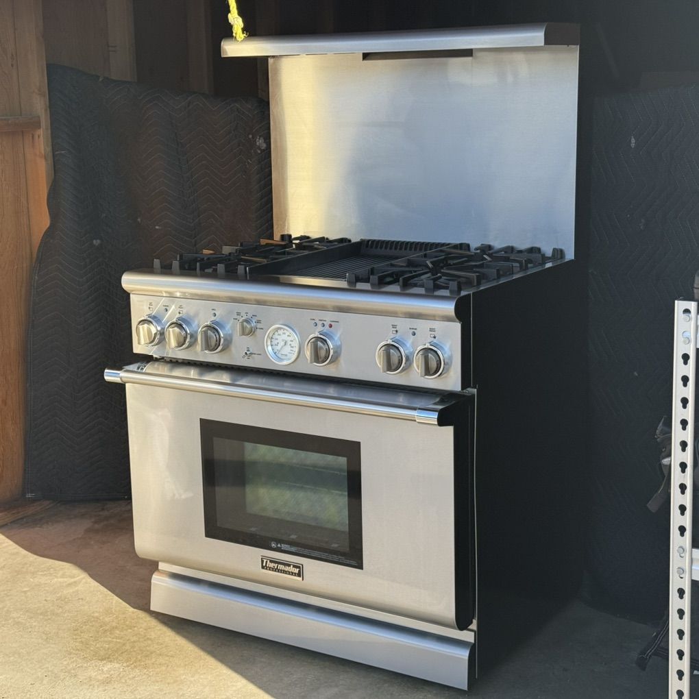 Used Thermador Pro 36 Inch Dual Fuel Range, 4 Star shaped sealed burners, Griddle , Electric Oven with Convection system. Set for Natural Gas and 220 v.
