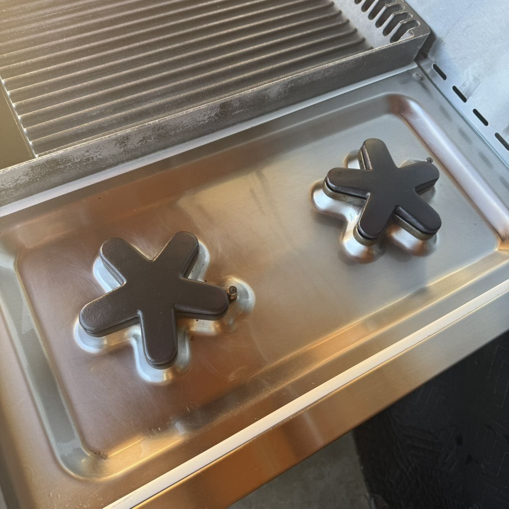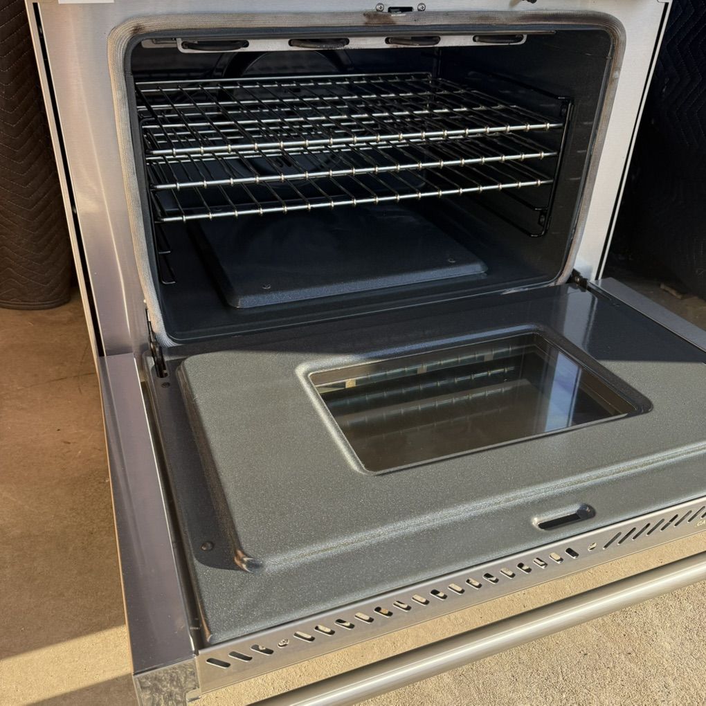 This is a previously used item in very good condition. There are some signs of use, like a few scratches on the stainless steel, normal wear on the grates. No dents. It has been tested and functions perfectly. It has been fully cleaned.