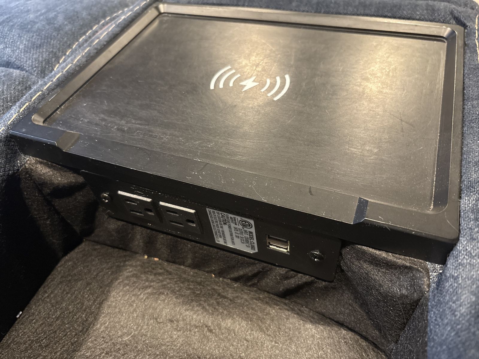 Power recline on both seats Center console with built-in wireless charging pad Pillow-top armrests and extra-thick cushioned backrests for maximum comfort Denim-style upholstery with decorative contrast stitching