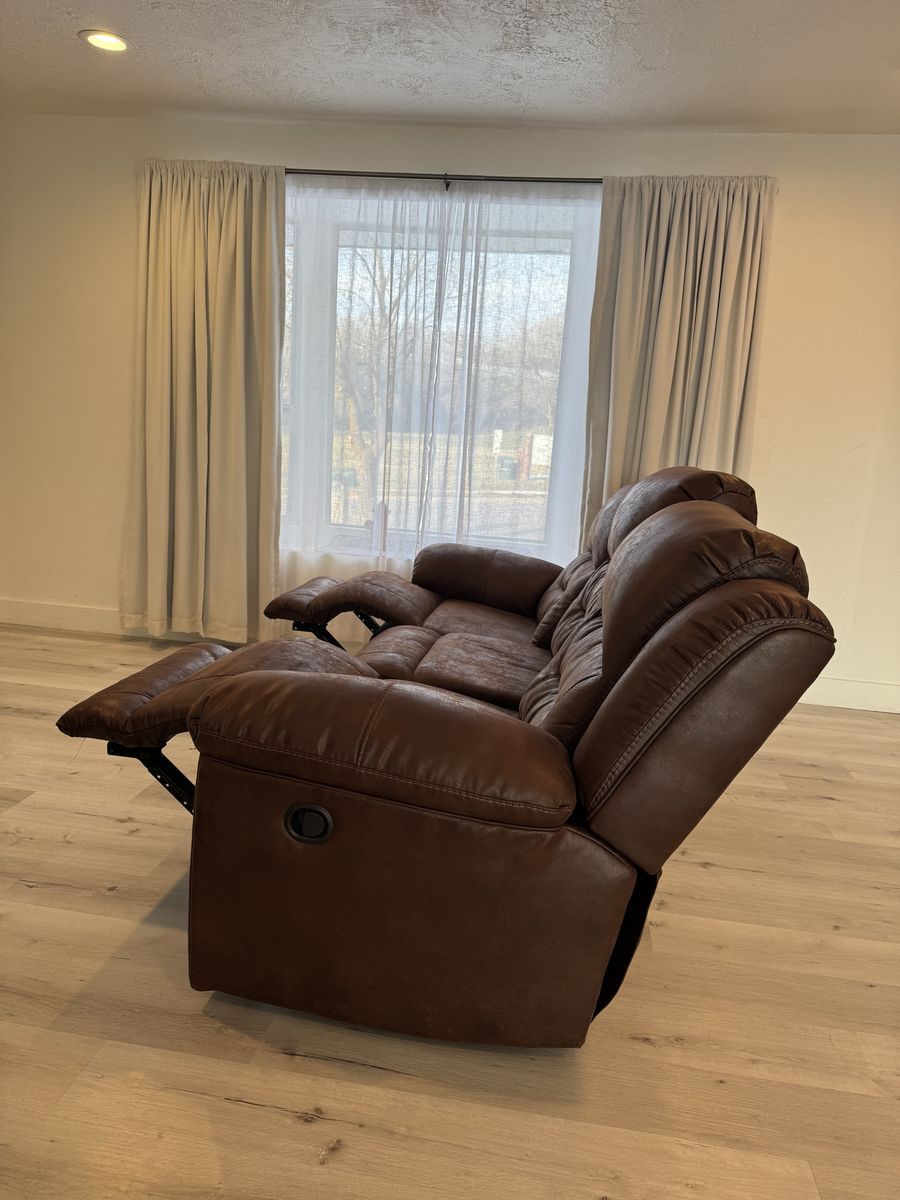 ApplePayLavenhorne Collection reclining sofa (RC Willey) in faux leather with contrast stitching — manual reclining end seats. Great condition; lightly used in a spare room.