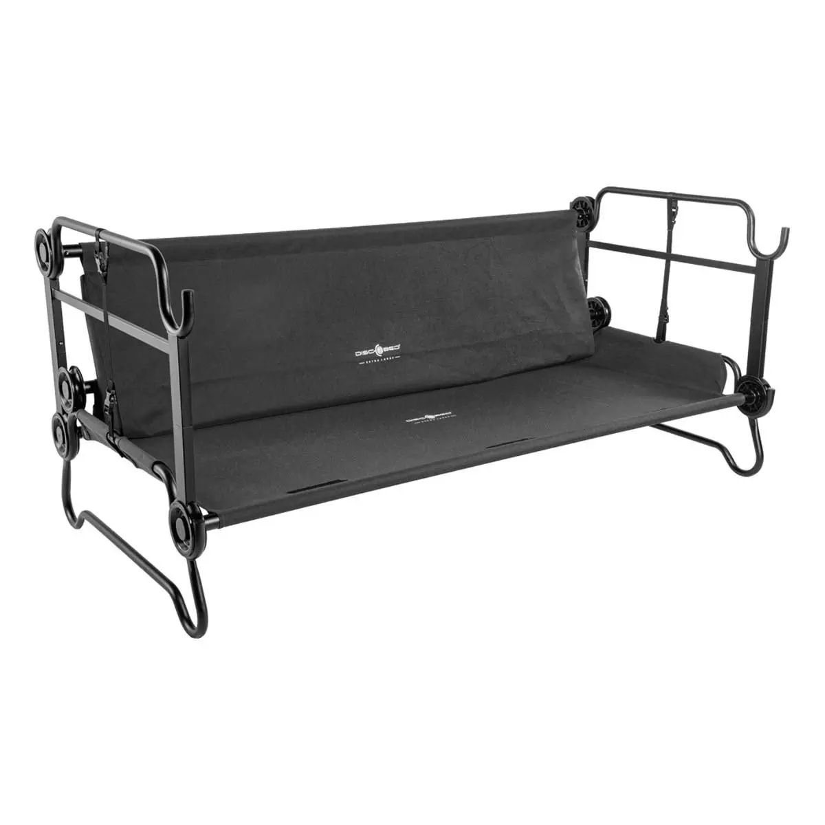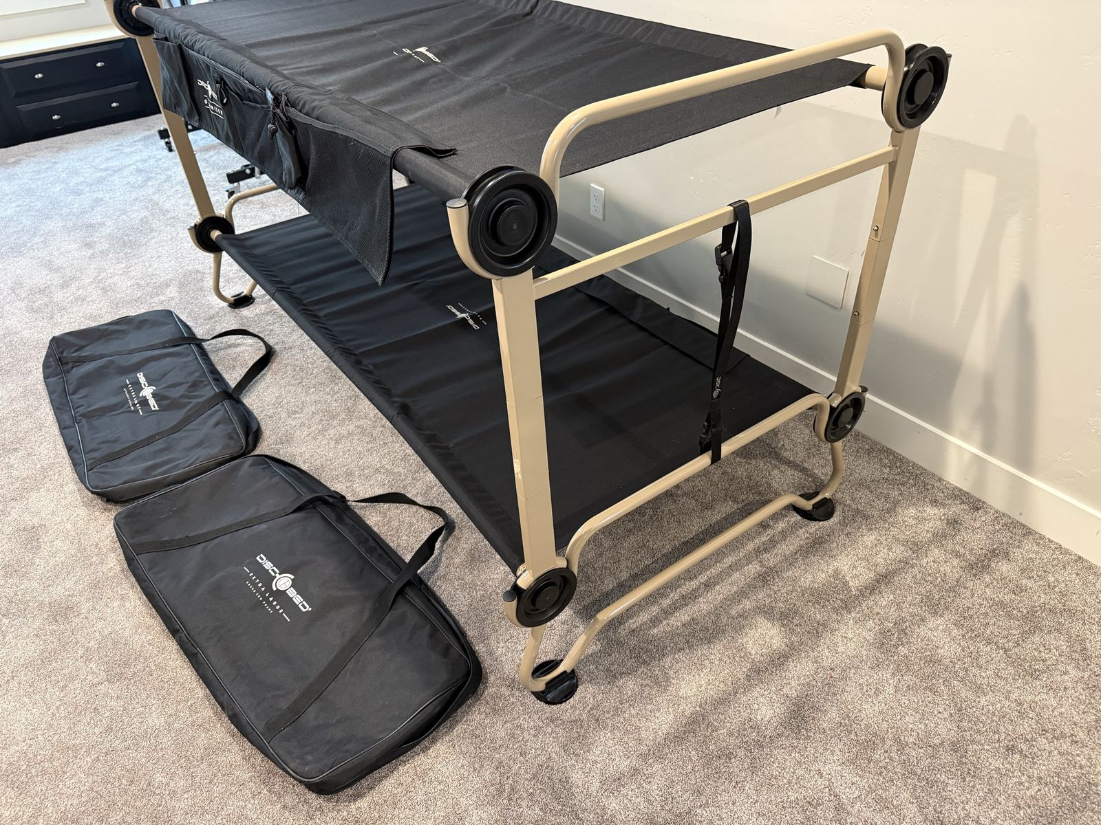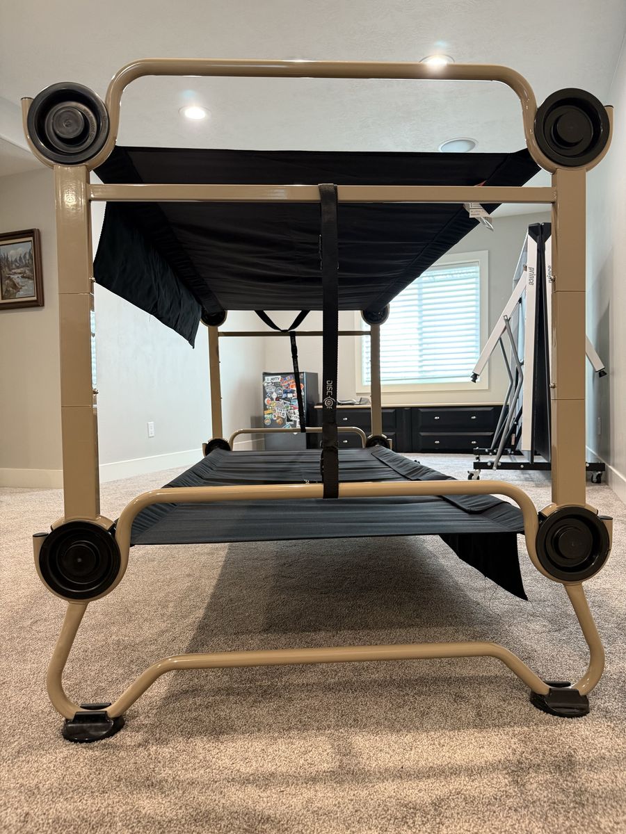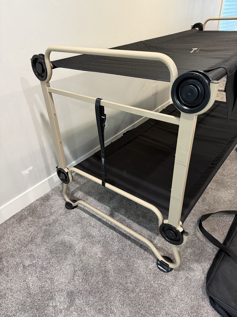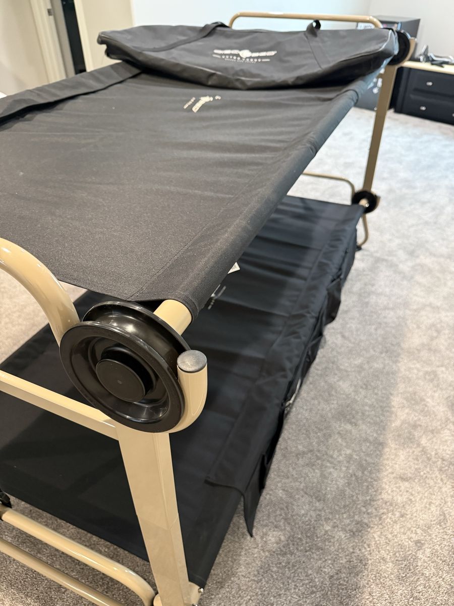 VenmoNew, never used. Black Disc-O-Bed XL bunkable cot system has a tan powder-coated steel frame. This portable sleep solution includes two side organizers with multiple pockets and a set of four rubber foot pads for floor protection. Set comes with two matching black zippered carrying bags for easy transport and storage. Modular design allows for use as a bunk, two single cots, or a bench. $550 new. Selling for $375.