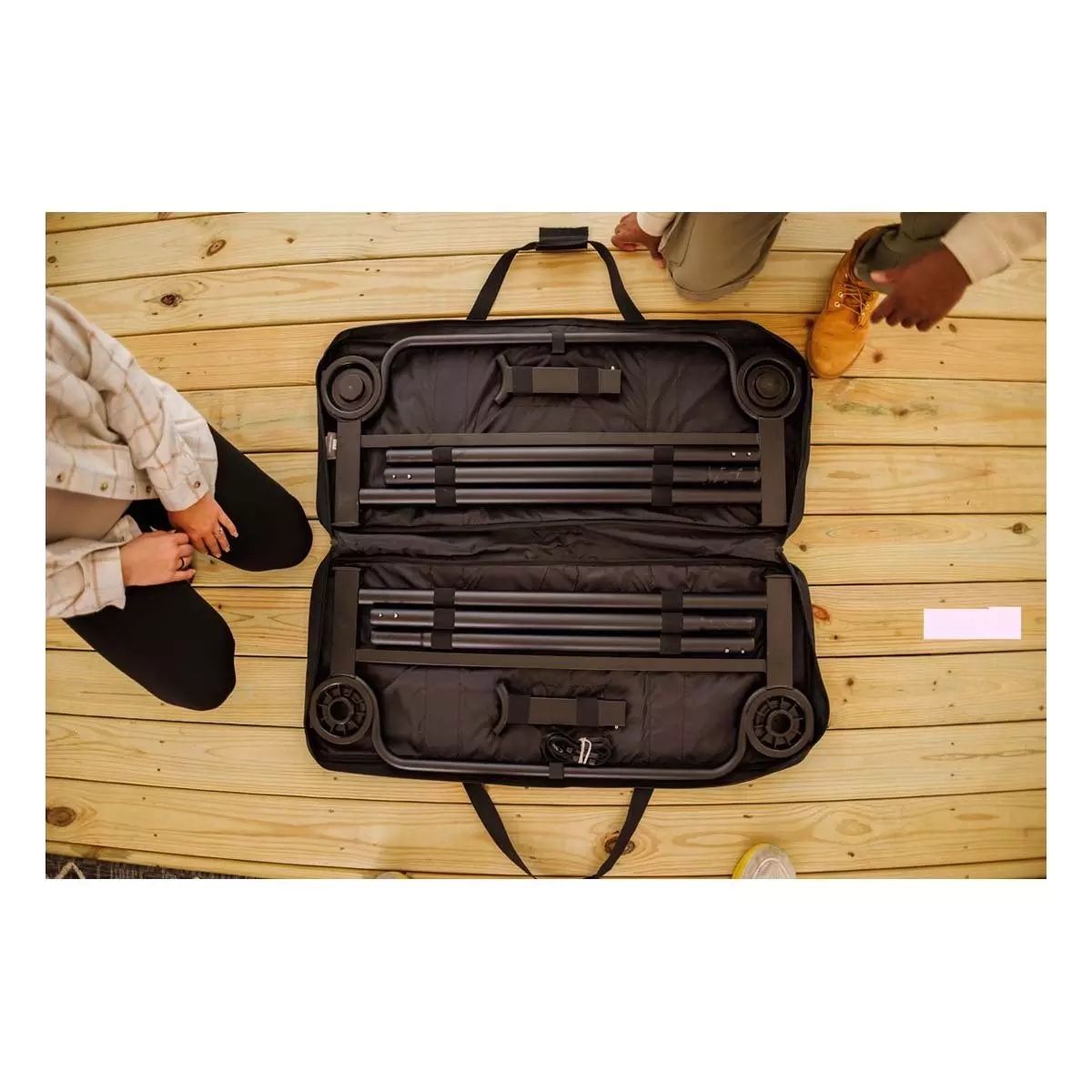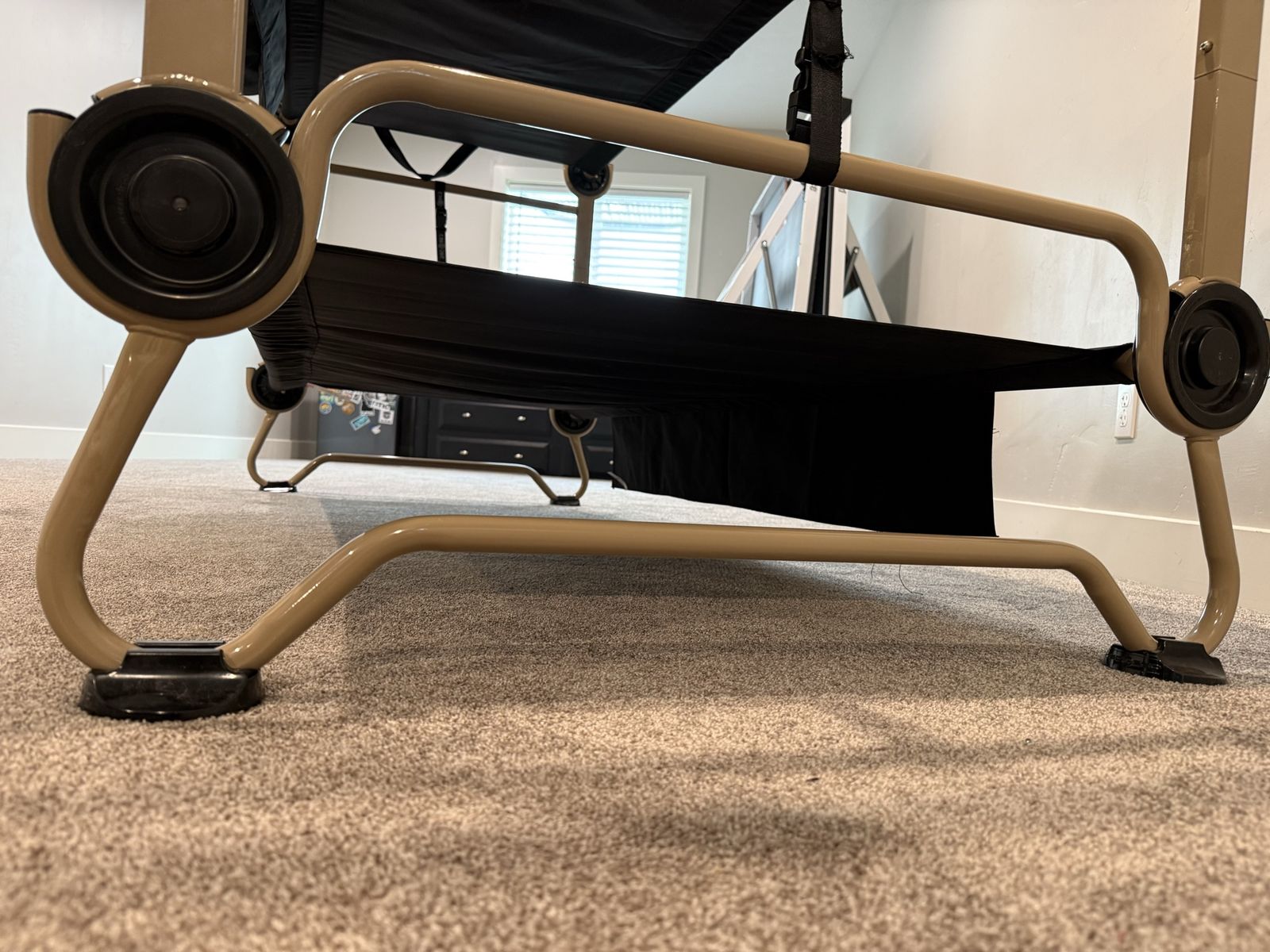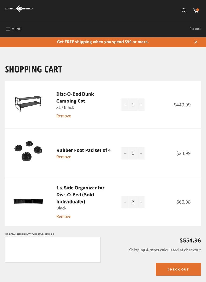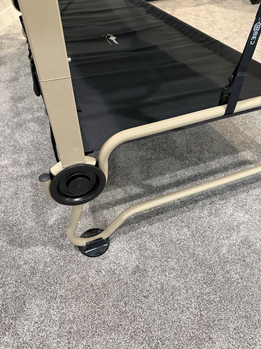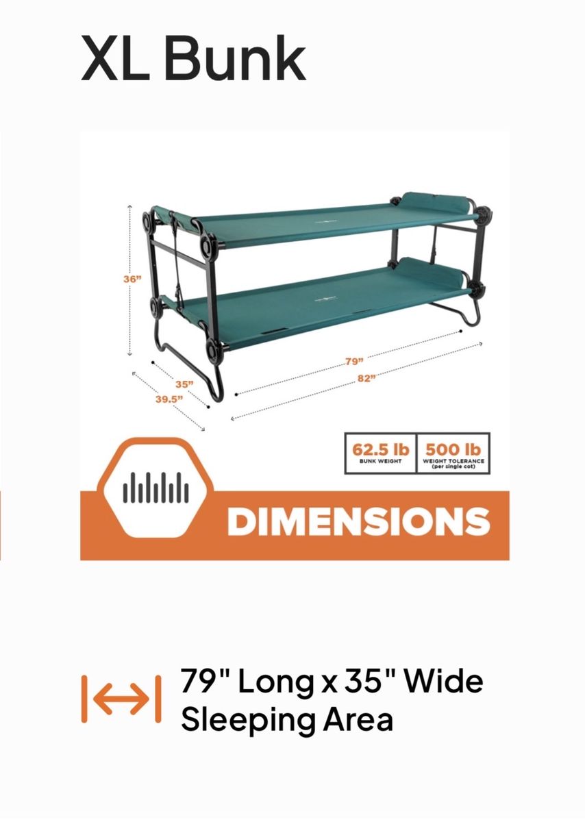VenmoNew, never used. Black Disc-O-Bed XL bunkable cot system has a tan powder-coated steel frame. This portable sleep solution includes two side organizers with multiple pockets and a set of four rubber foot pads for floor protection. Set comes with two matching black zippered carrying bags for easy transport and storage. Modular design allows for use as a bunk, two single cots, or a bench. $550 new. Selling for $375.