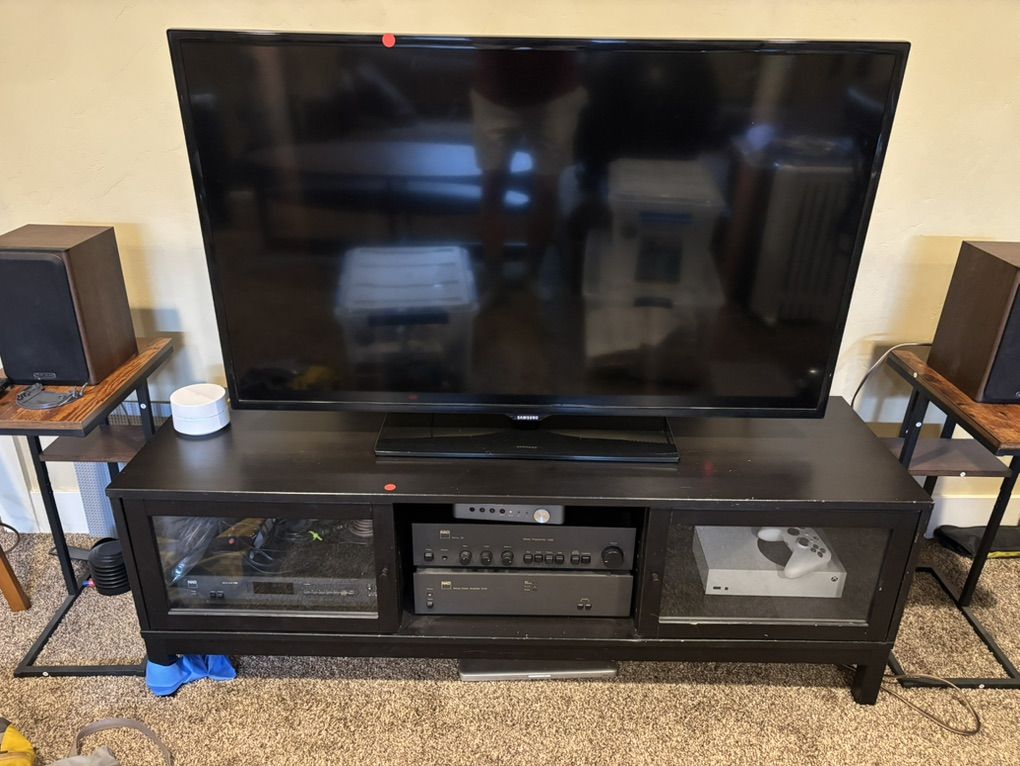 ApplePayBlack IKEA TV stand / console with sliding glass doors.