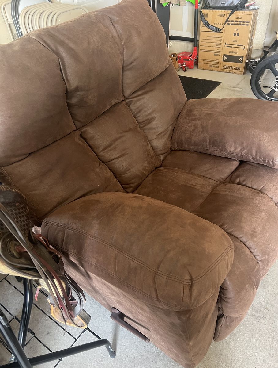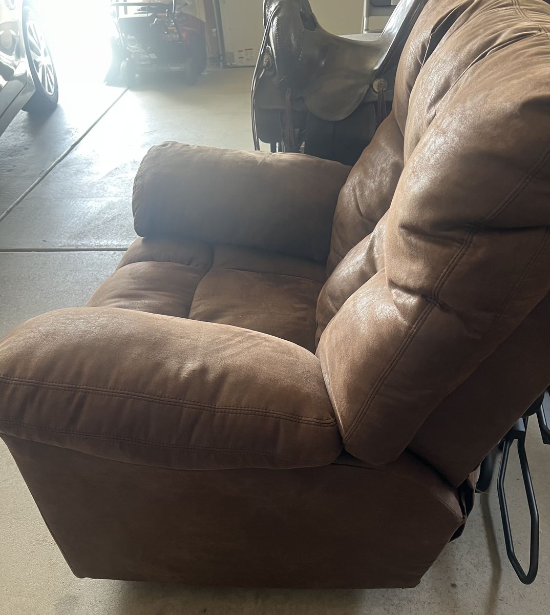 VenmoJust like brand new!! The overstuffed cushions, tailored with beautiful topstitching and upholstered in easy-to-maintain dark brown faux leather. The pull-tab reclining mechanism is easy to use.