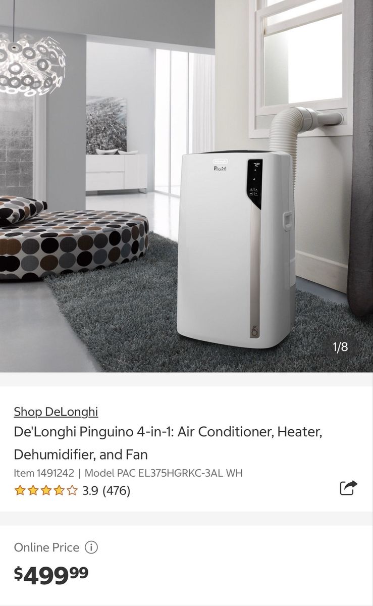 ZellePortable AC unit with heating, fan, and dehumidifying settings as well. Worked great for us when we lived in an apartment, selling now that we have central AC. Serves up to 500 sq feet, multiple rooms. New unit retails at Costco for $500.