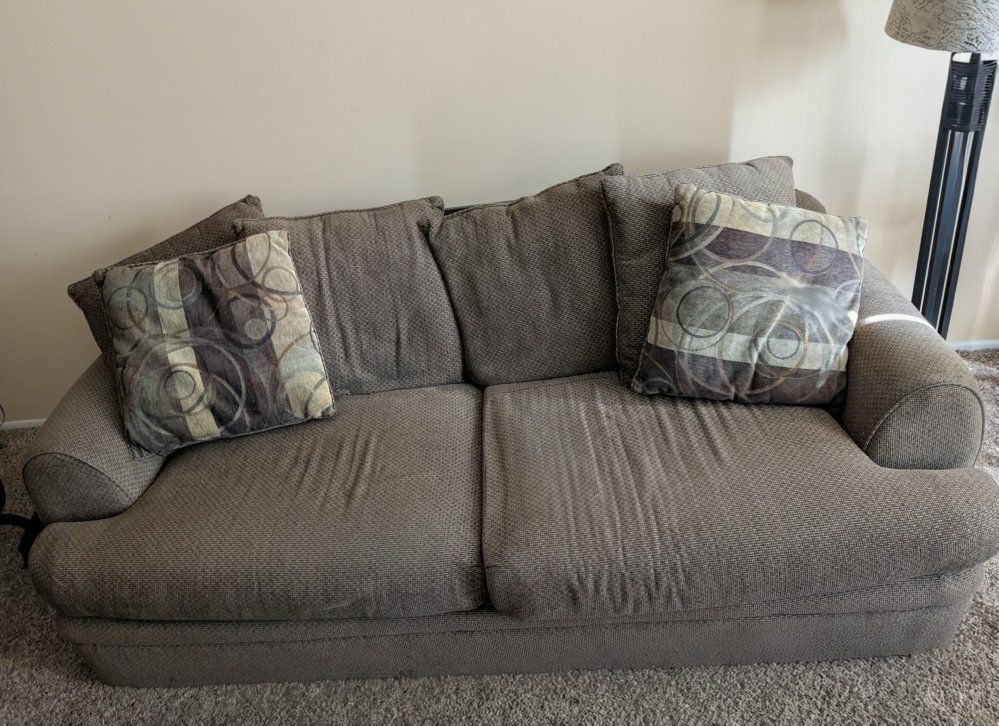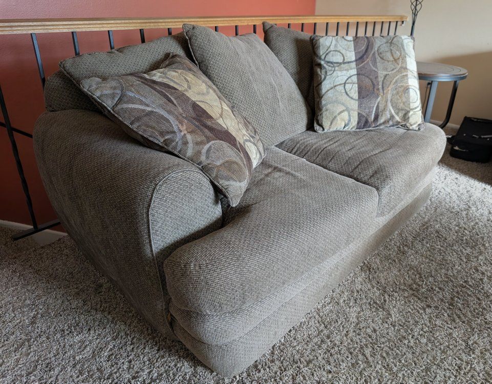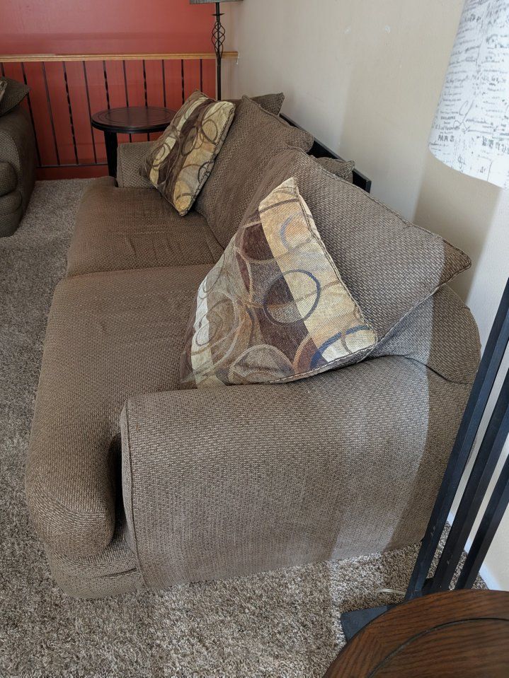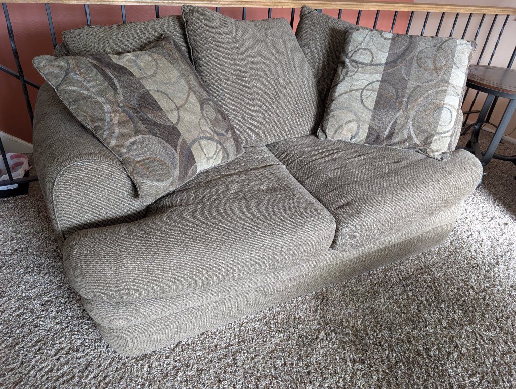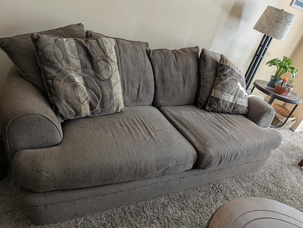 VenmoComfy brown sofa and loveseat set. Has textured fabric. Comes with matching throw pillows.