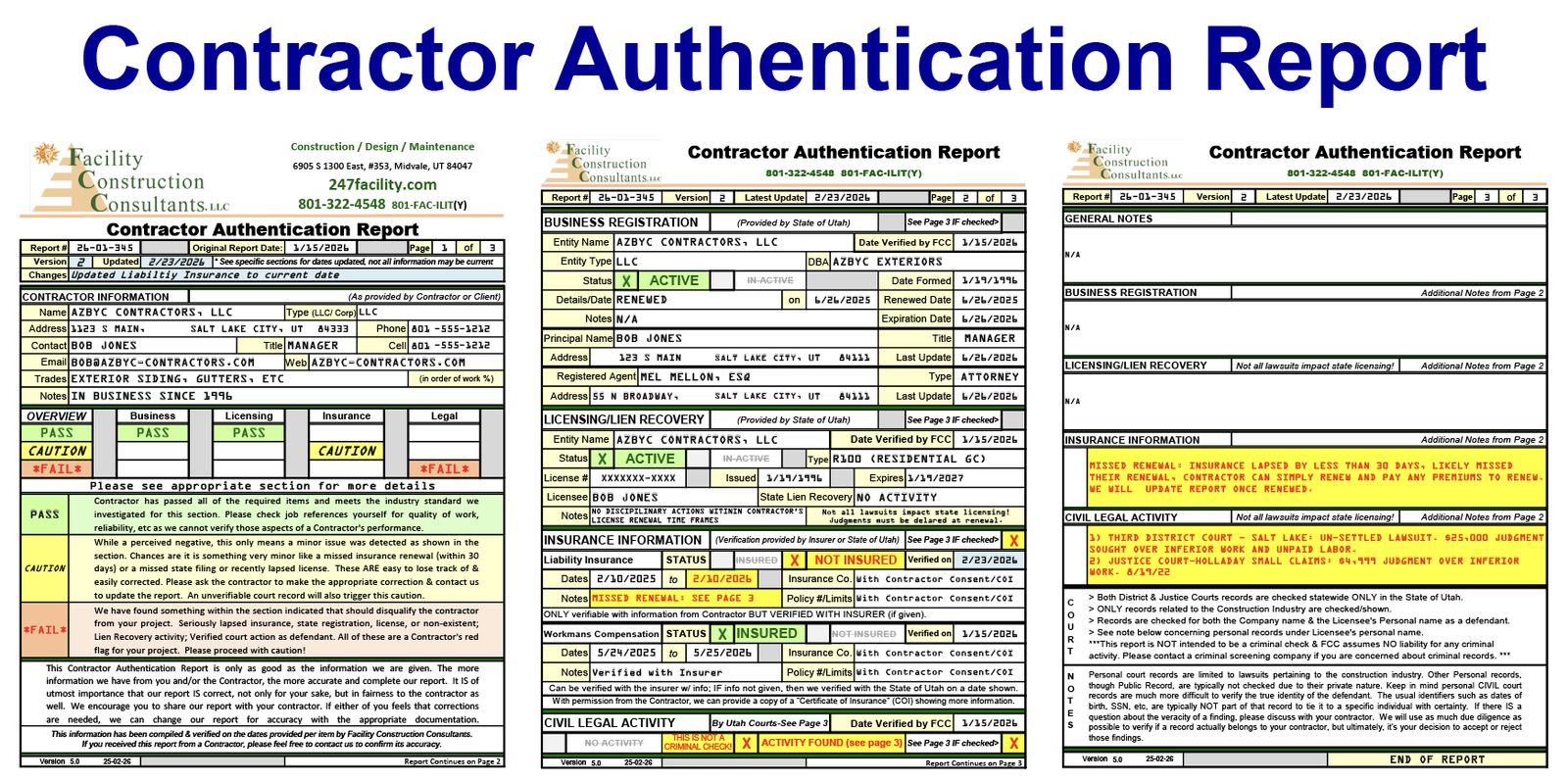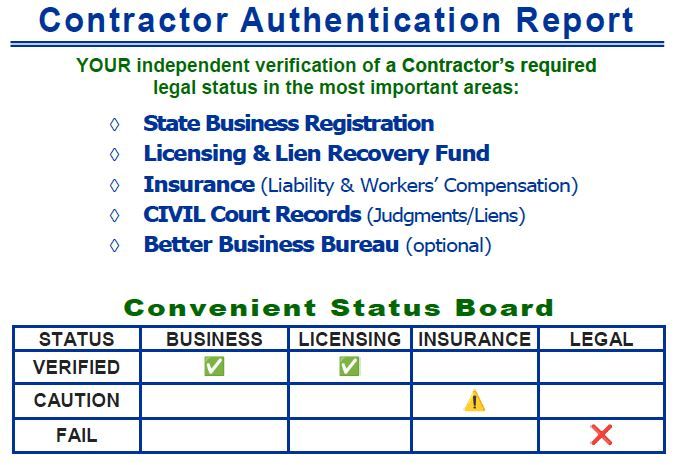 NOTE: WE ARE NOT A CONTRACTOR nor do we refer Contractors or investigate their quality. We just VERIFY their BONA FIDES via the hard facts above!