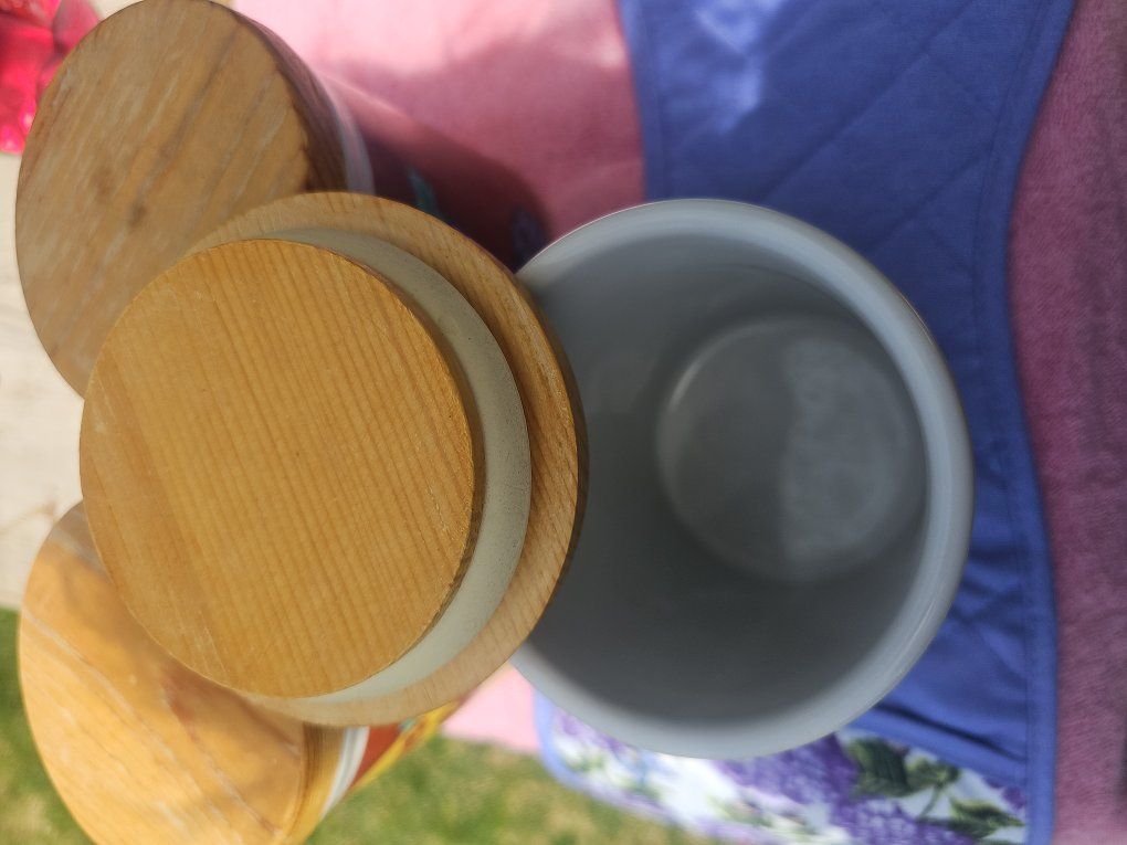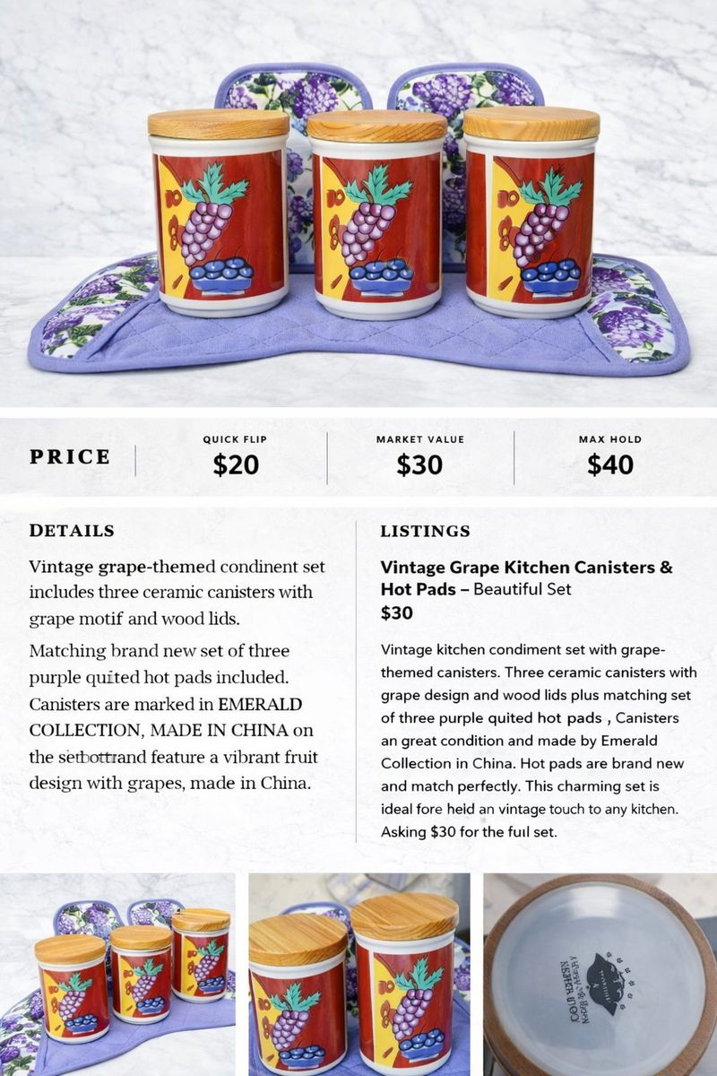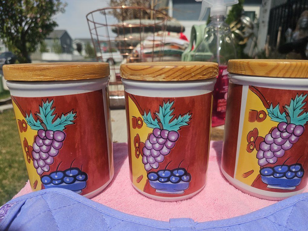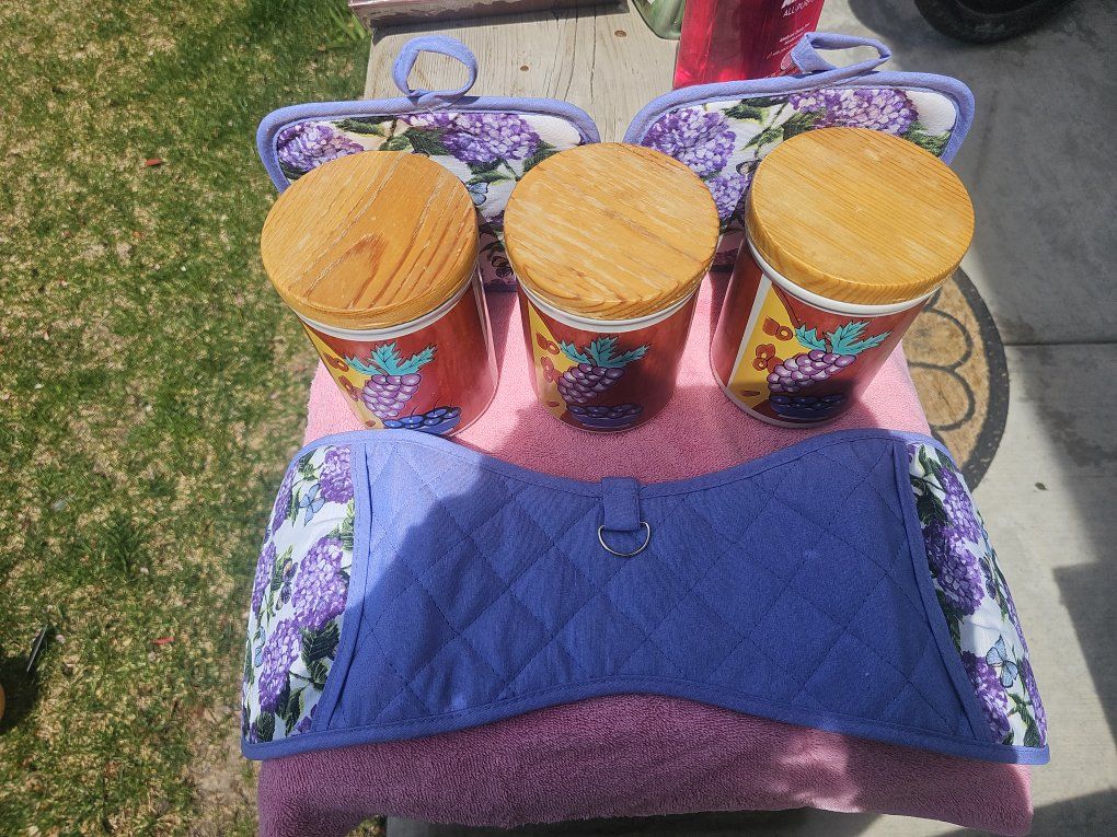 Description: Vintage grape-themed kitchen canister set with matching hot pads. Includes: • 3 ceramic canisters with wood lids • Grape / fruit design (Emerald Collection) • 3 matching quilted hot pads (brand new) Great condition, clean, and ready to use or display. Adds a nice vintage touch to any kitchen.