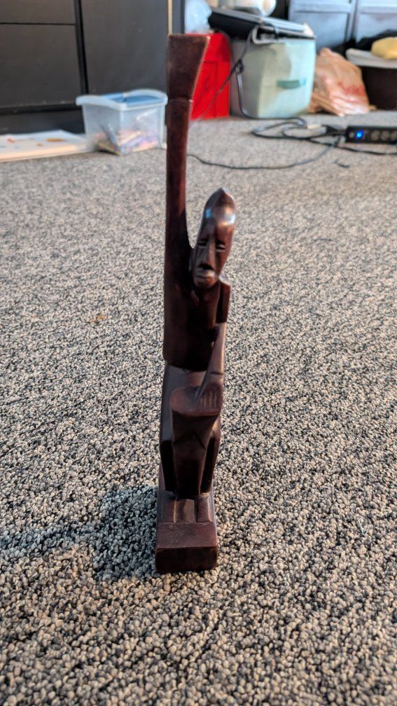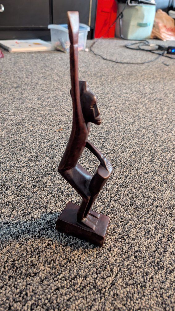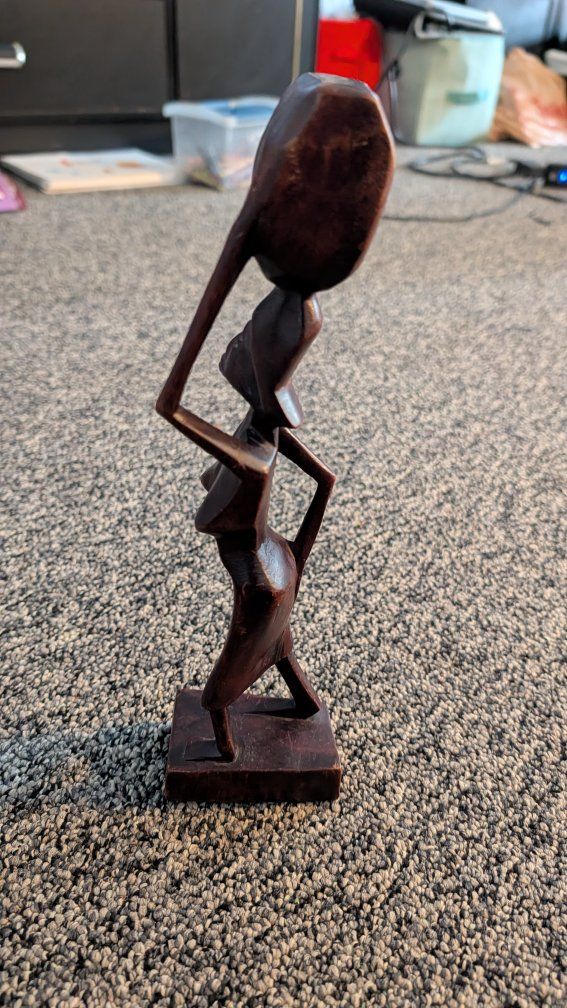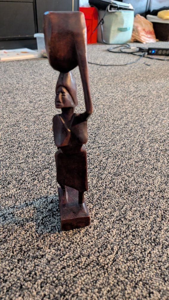 This item is a vintage, hand-carved African wooden sculpture, often depicting figures such as women carrying water or tribal members. These sculptures typically feature elongated forms and stylized designs, commonly made from materials like teak or other dark woods. They are popular as decorative folk art and collectibles. Text if interested. Asking $10.00 each or both for $15.00