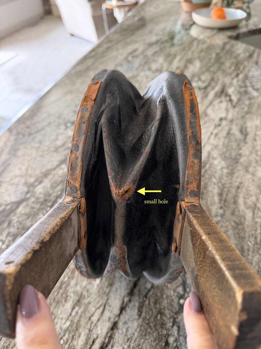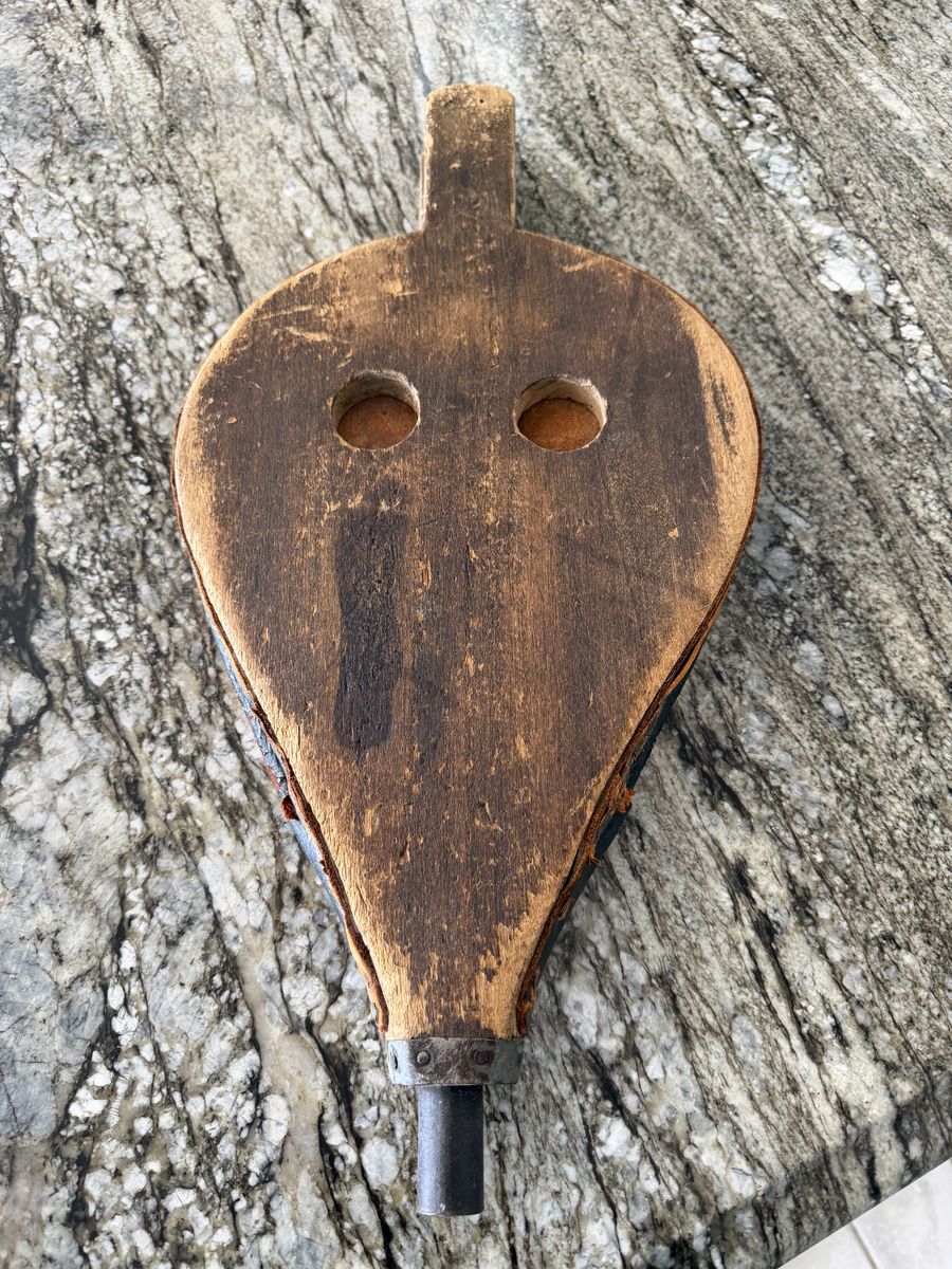 VenmoAntique wood and leather bellows. My great-grandfather was a metal moulder and owned his own foundry in the early 1900's - 1950's. The leather is aged and has some cracking. Bellows still work despite small hole where the leather folds. Measures 19 1/2 inches long and 9 1/2 inches at the widest part.