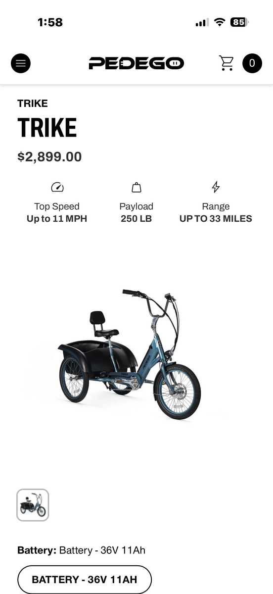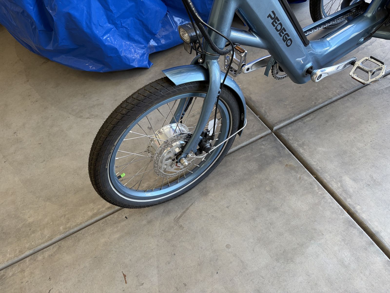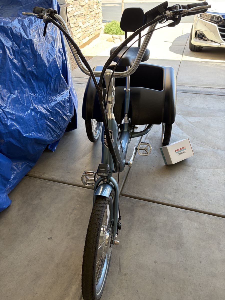 VenmoNew Pedgo Trike (never used) with 500 watt whisper quiet motor and lightweight 36 volt 11 Amp hour battery. It has a 3 speed hub providing easy pedaling and smooth shifting, a Twist-and-go throttle, 2 levels of pedal assist and an LCD display with USB charger. It is designed for maximum comfort and stability, with an extra spacious storage container including rear fenders to help keep you clean and dry.