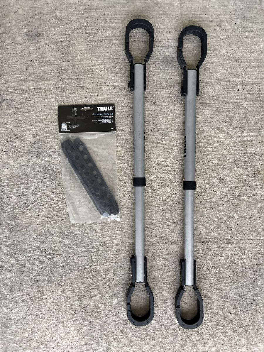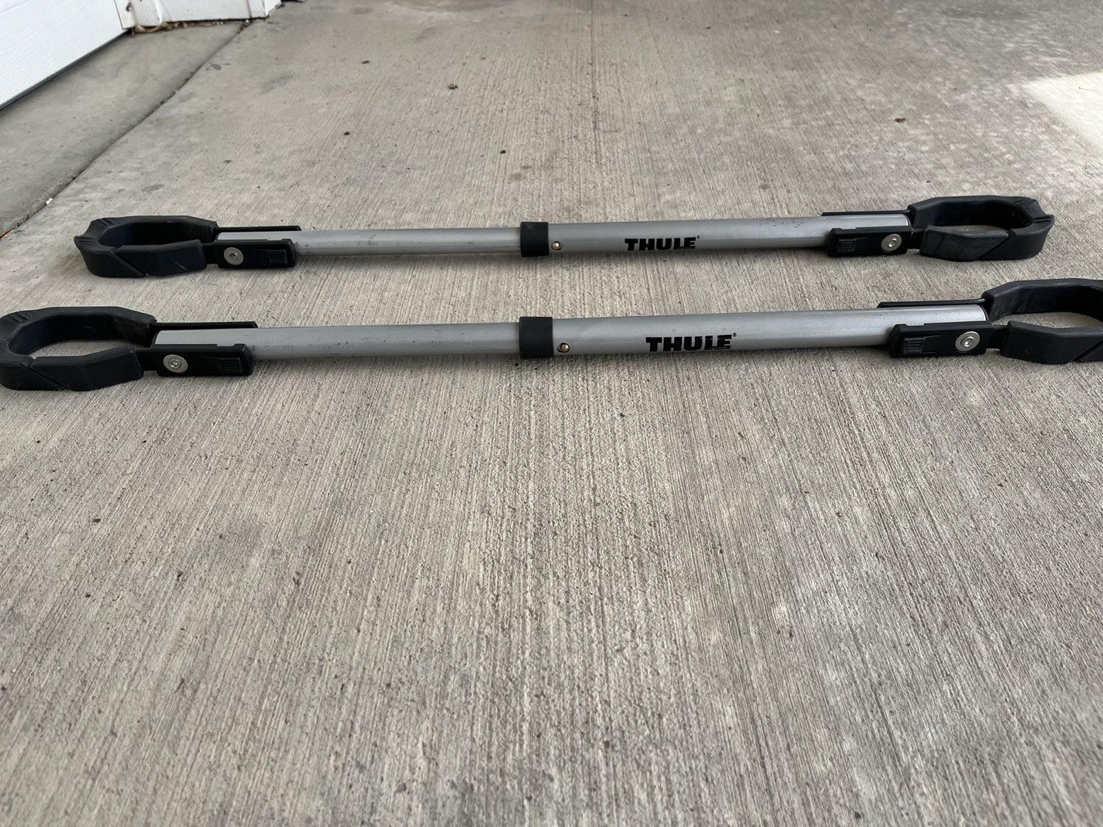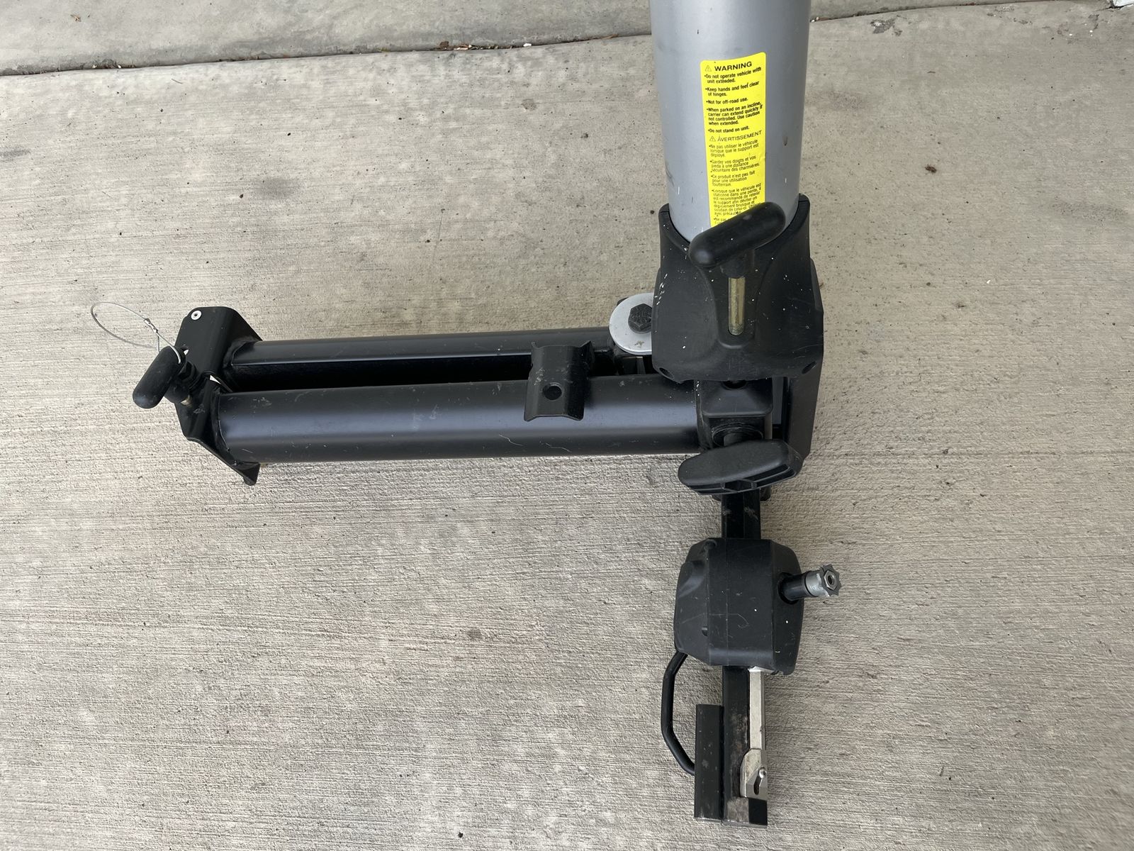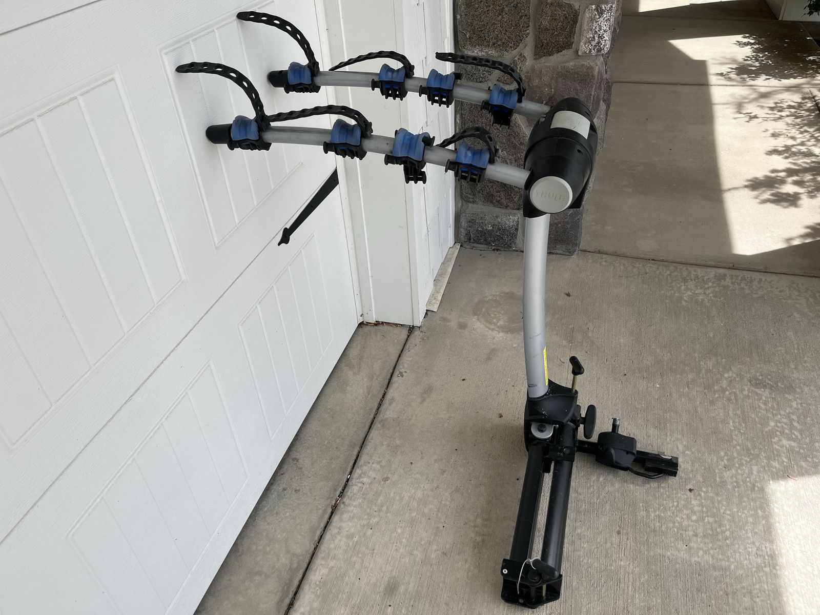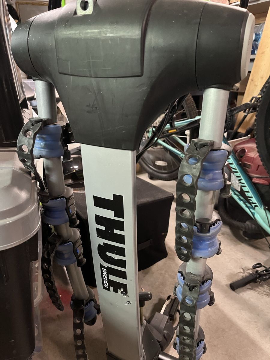 ZelleThis model allows for a quick and easy swing of the rack and bikes to the passenger side of your vehicle for convenient access to the rear hatch or trunk. Lightly used. Carries 4 bikes. Accepts most common sizes of bikes. Also included are 2 Thule adjustable length frame adapters that serve as top tubes to simplify loading. Four new tie down straps included. The plastic knob for tightening the hitch clamp (to prevent swaying in the receiver) is gone, but a basic pair of pliers does the job well. Thule’s current edition of this rack lists at $699.95. The frame adapters sell for $59.95 each.