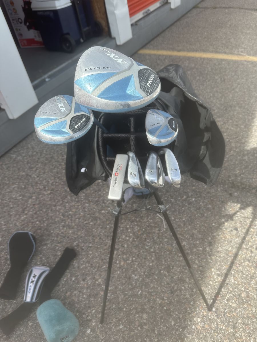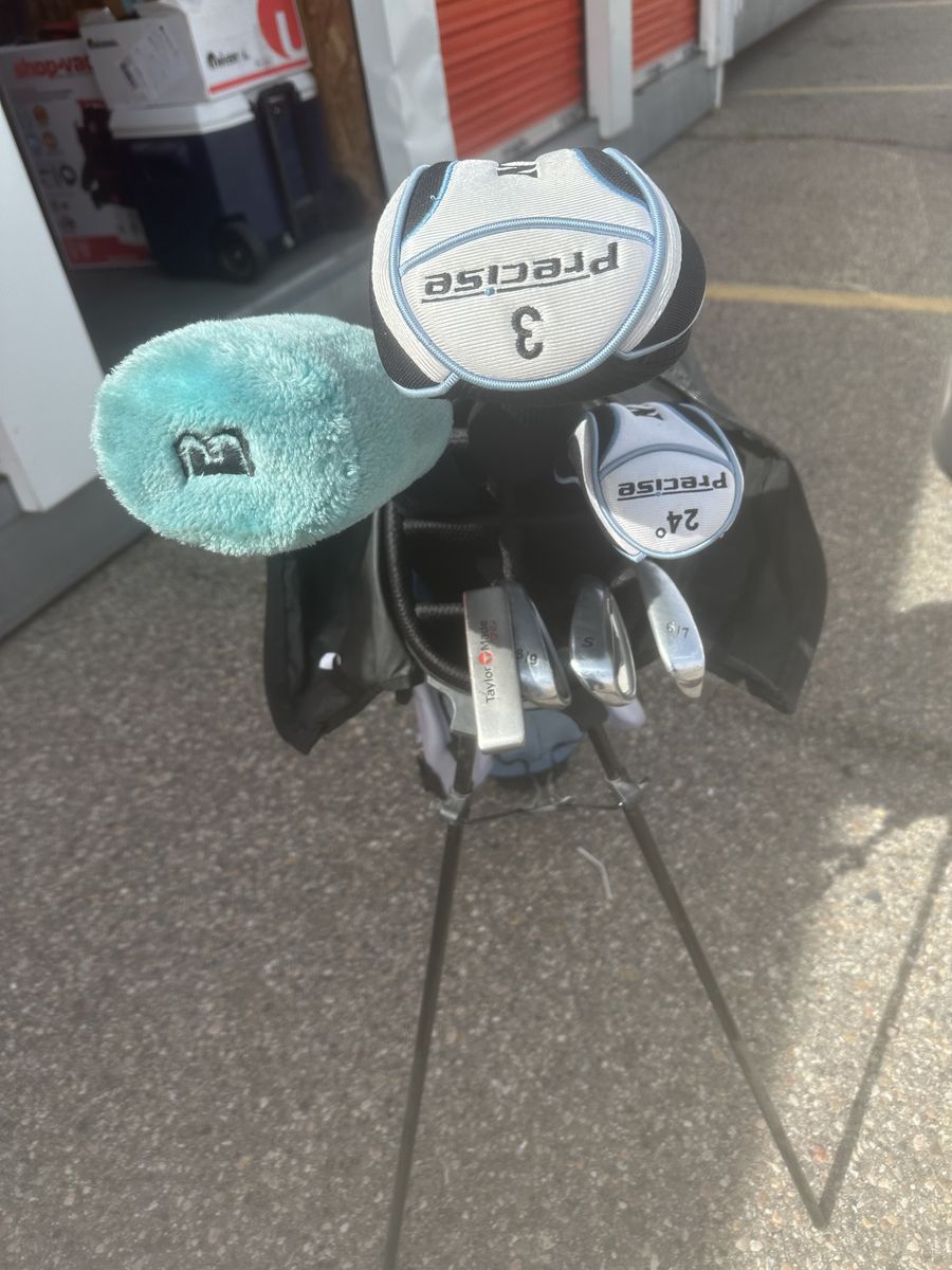 Precise golf set in bag for women. Taylor Made putter. Golf balls & tees. Some fraying on over the shoulder carrying strap.
