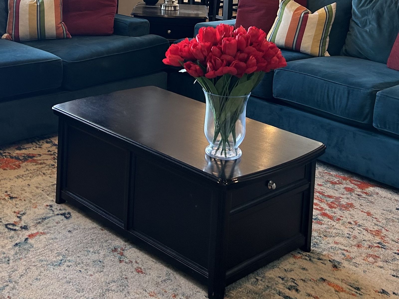VenmoThis table has tons of storage! Well-cared for, but does have some small nicks. A bit of the finish has rubbed off on one of the edges. (See detail photos & video.) Carlyle collection coffee table. 4 drawers, lift-top table. Solid piece of furniture. 46.25”W, 26”D, 18.75”H