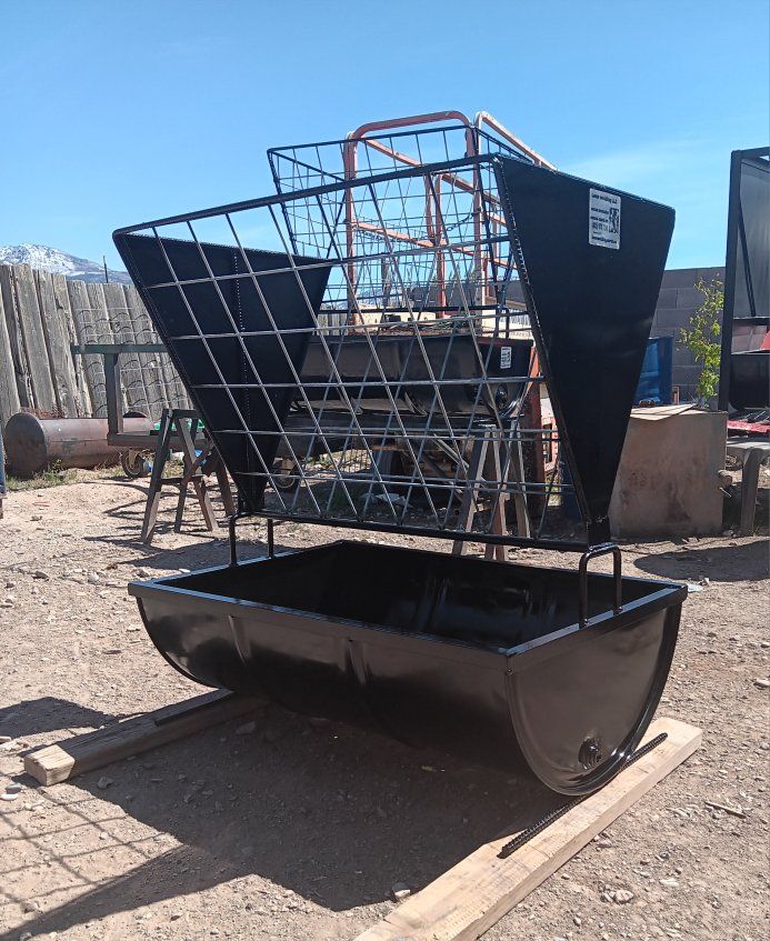 ZelleNew, a steel, heavy-duty, high-quality, goat/sheep feeder, comes with a big cage 23"x 35, side plates to help stop the wind from blowing the hay away, and a big tub surrounding the cage, to catch anything that falls off , that way nothing goes to waste, the tub its about 24"×36", 13" off the ground; the whole unit its coated with rust-resistant oil base paint.