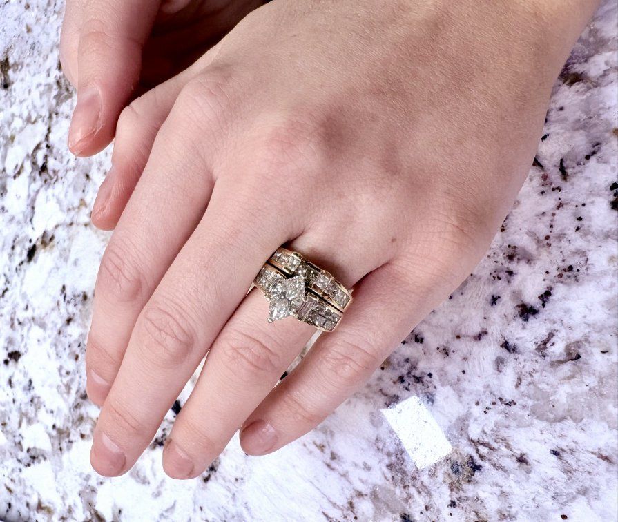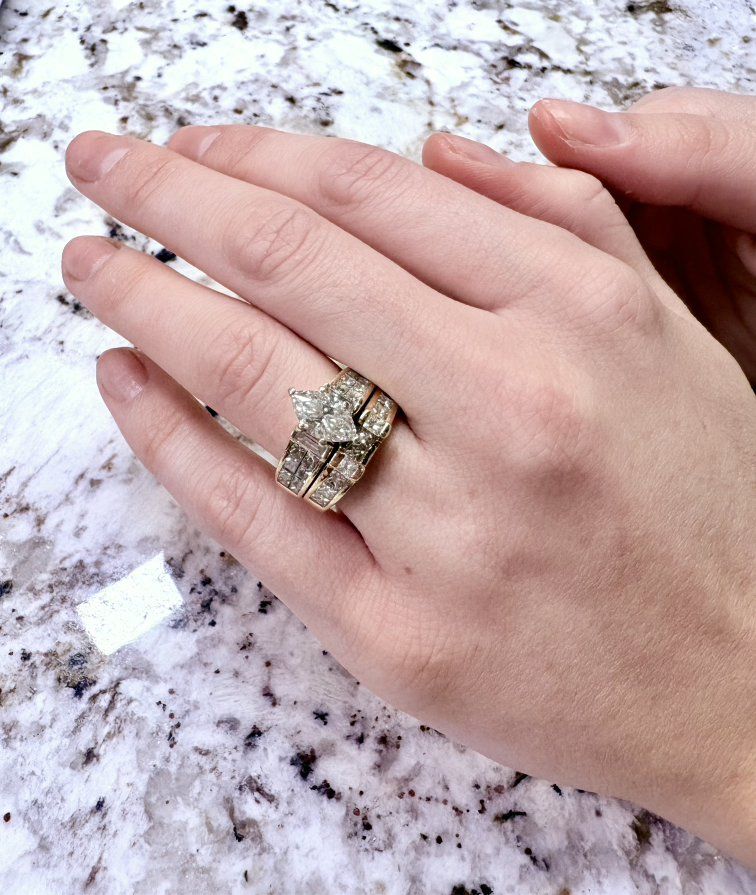 Custom, one of a kind, wedding set with 28 diamonds that are channel set around a nearly 2 carrot marquis cut center diamond. Appraised at $26,000. Asking $16,000… obo. High quality setting that is sure to please. Call before this great deal is gone.