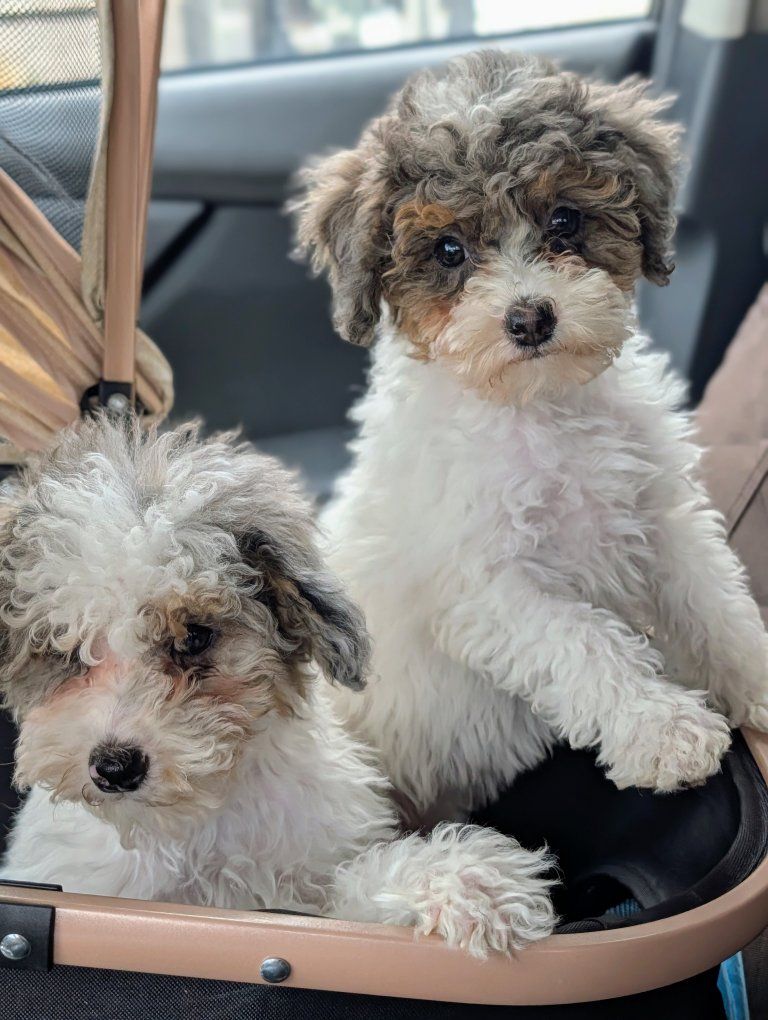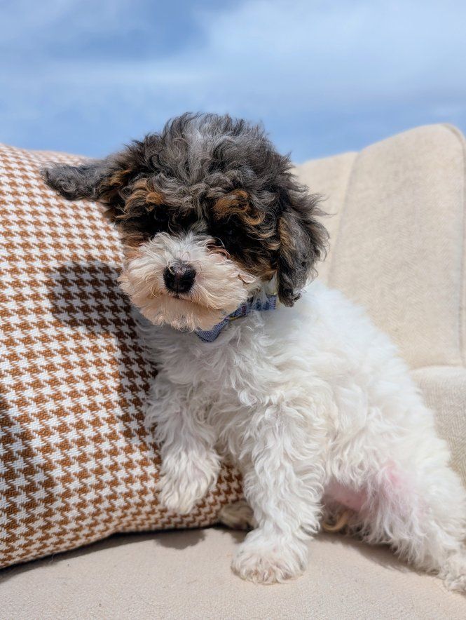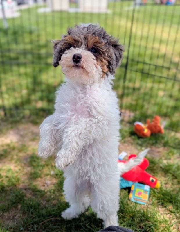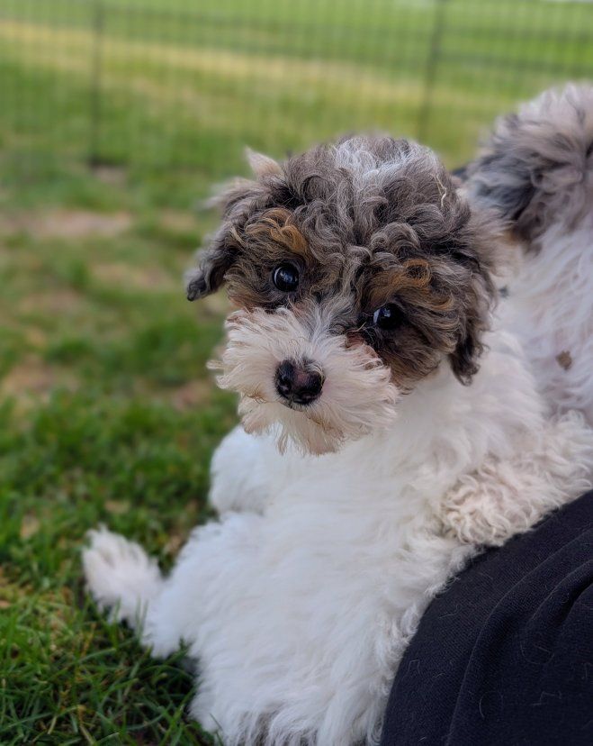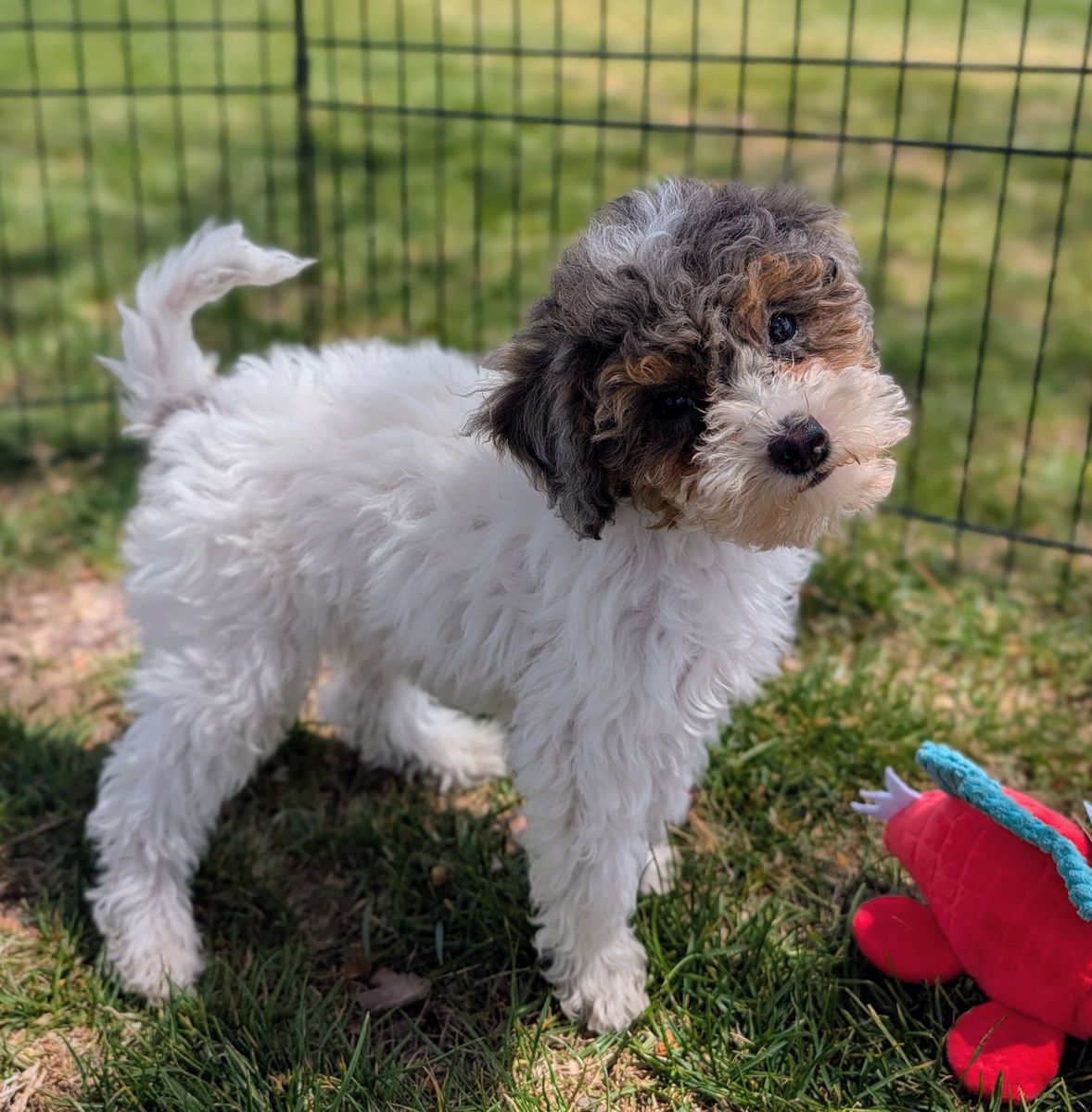 VenmoStarlight is the smallest puppy in the litter and has the biggest personality in the room. She is a merle tricolor Mini Labradoodle female with playful, spunky energy that is genuinely entertaining to watch. She loves her people but she's also confident enough to self-entertain when you're busy, which makes her as practical as she is fun.